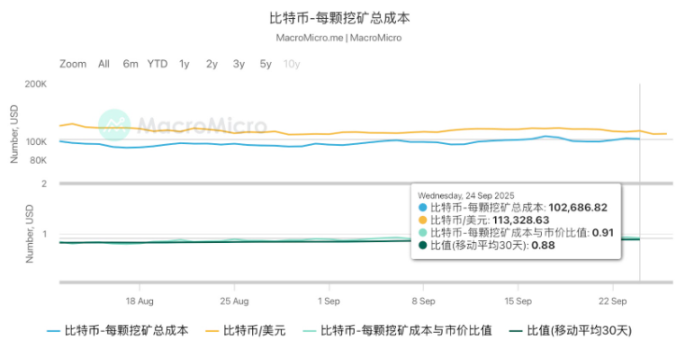 從成本視角,MacroMicro 估算 9/24 比特幣生產成本約 $102,686.82,現貨約 $113,328.63,成本 / 價格比為 0.91,約 9% 毛利。本週毛利略為壓縮;整體仍有利可圖,但若價格下行,弱勢礦工壓力上升,可能帶來算力波動或遷移至低成本地區。