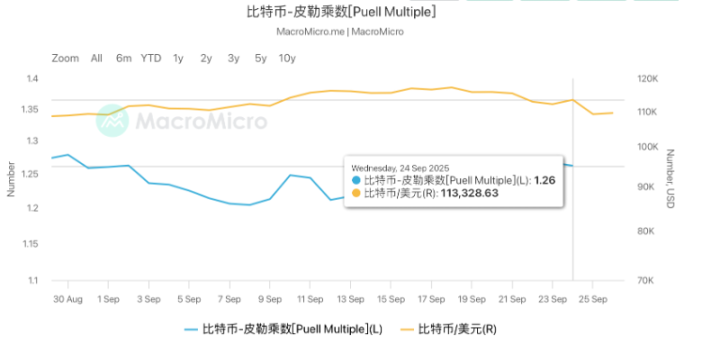 鏈上 Puell Multiple 維持 1.24–1.27。該指標比較每日發行價值與年度平均,衡量礦工獲利與市場過熱(>2 視為過熱)。目前區間顯示礦工獲利尚可、未過熱;但本週兩次急跌令高成本礦工現金流吃緊。整體上,Puell 指標尚佳,但波動使風險分層:短線算力小幅擺動可能性上升,高成本礦工承壓,低成本礦工相對穩健。