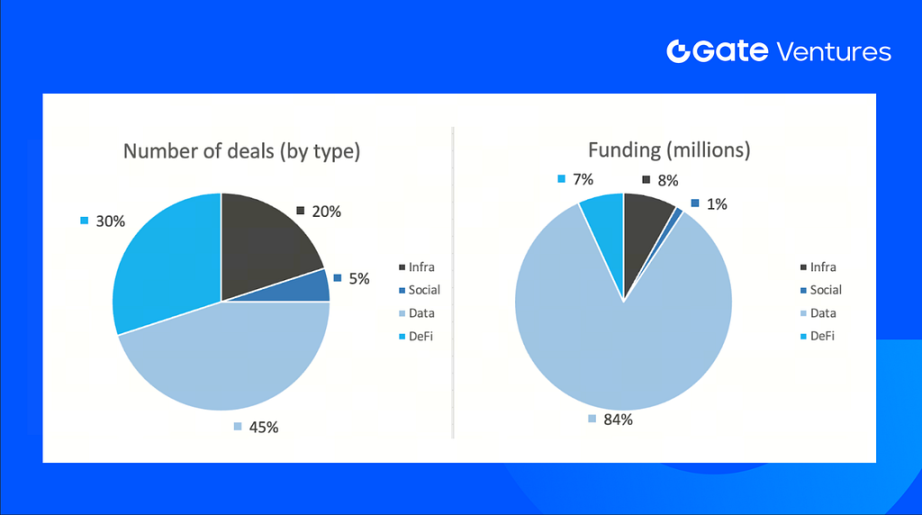 The number of deals closed in the previous week was 20, with Data having 9 deals, representing 45% for each sector of the total number of deals. Meanwhile, Infra had 4 (20%), Social had 1 (5%), and DeFi had 6 (30%) deals.