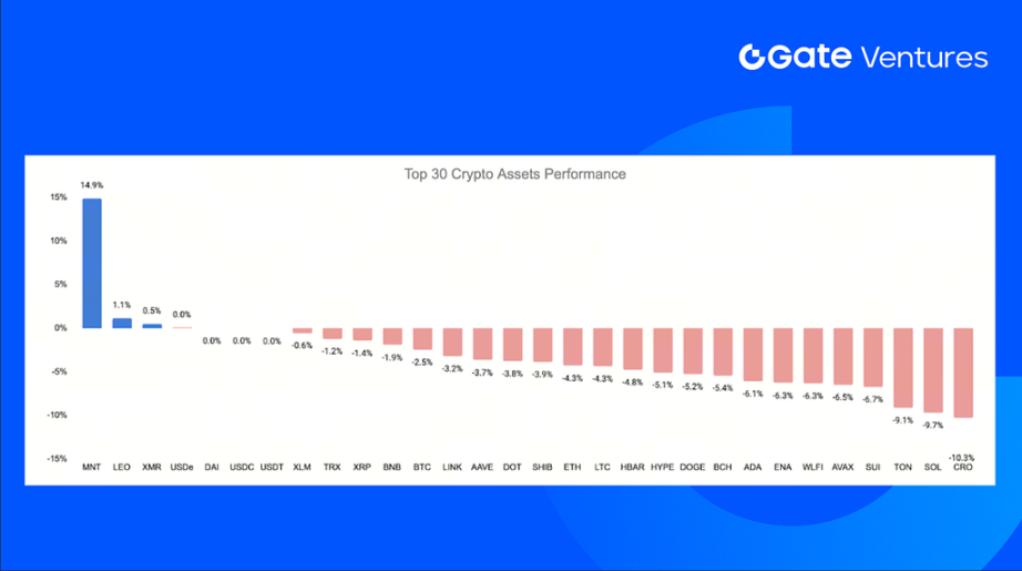 The market broadly trended lower, though select tokens like MNT, LEO, and XMR outperformed, with MNT leading the pack with a 14.9% gain.