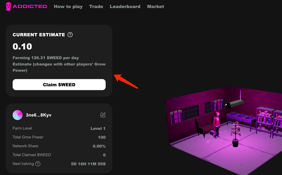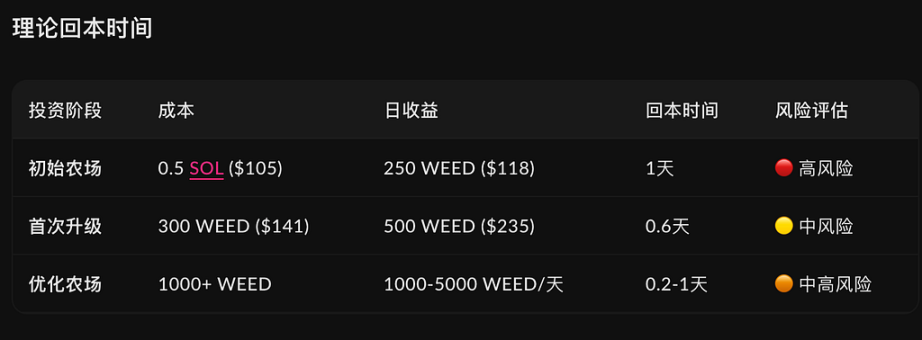 在很多人还处于假期的时候,昨天半夜 Solana 官推突然转发了一个游戏 Addicted,入门成本:0.5 SOL(约 $105);理论回本时间:1.5 天(目前 125 WEED/ 天收益,约 $66 价值)。