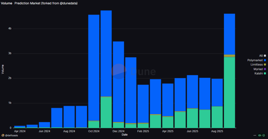在 9 月,链上订单薄赛道迎来大幅增长,其中 Perp DEX 和预测市场是主力军。以 Hyperliquid、Aster 和 Lighter 为首的 Perp DEX 创下了万亿美元的月度历史交易量,而以 Polymarket 和 Kalshi 为代表的预测市场同样创下了自去年大选月以来的新高。在这些细分赛道中,不同协议的竞争持续加剧,依靠积分激励和高涨的代币预期,Aster 和 Lighter 纷纷超越 Hyperliquid,每日交易量达到上百亿甚至数百亿美元;第二梯队的 edgeX、Pacifica 和 Paradex 也同样迎来大幅增长,每日交易量飙升至十亿美元以上。预测市场也从过往的寡头市场,变成 Polymarket 和 Kalshi 双雄竞争,各自纷纷推出生态激励计划以获取市场份额;由于前二者或志在冲击上市,第三大预测市场 Limitless 夺得了发币先机,在 Kaito Launchpad 超募资金 200 倍,创下了 Kaito 最高的筹资记录。