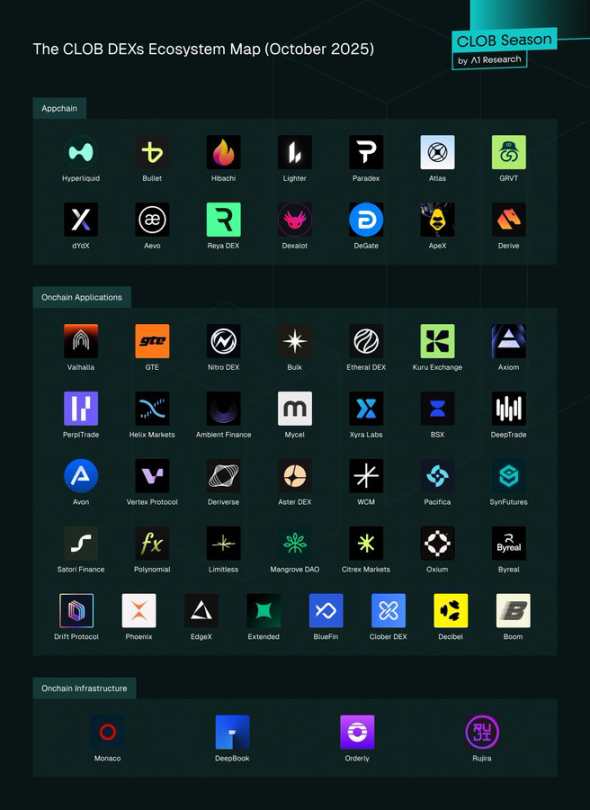 根据 AI Resarch 的分类,CLOB 赛道可以具体细分为 Appchain、Onchain Applications 和 Onchain Infra。Appchain 代表 Hyperliquid、Bullet、Hibachi 和 Lighter 等;Onchain Applications 代表有 Valhalla、GTE、Aster DEX、edgeX 和 BlueFin 等;Onchain Infra 代表有 DeepBook 和 Ordely 等。