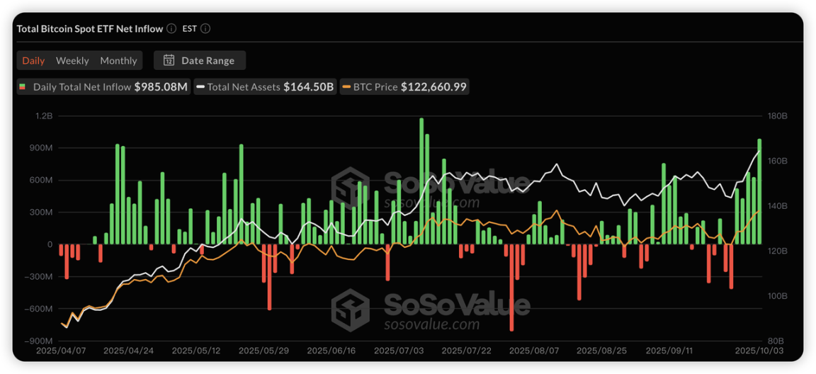 比特币在今日突破 125,000 美元,再创历史新高。这股势头背后,是美国现货加密货币 ETF 市场的强劲表现。上周,BTC ETF 单周净流入高达 32.4 亿美元,创下历史第二高纪录,同期 ETH ETF 的净流入也达到了惊人的 13 亿美元。市场的狂热远未结束,SEC 正准备在 10 月对至少 16 种新的加密货币现货 ETF 做出最终裁决,其中包括 SOL、XRP、LTC 等备受瞩目的代币。为了加速这一进程,SEC 近期通过了通用的上市标准,审核时间有望缩短至 75 天以内,彭博社 ETF 分析师甚至预测,SOL 现货 ETF 的获批概率现在“基本上是 100%”。