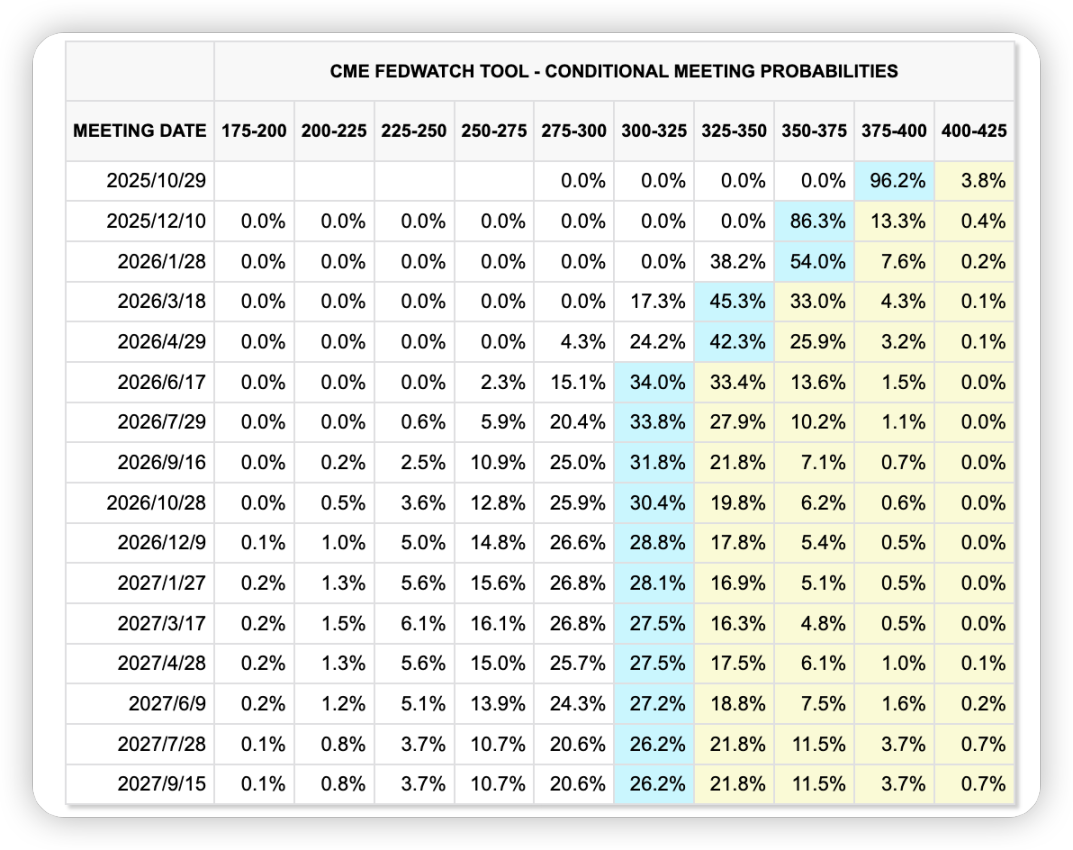 于是,华尔街不得不将目光投向了“替代数据”。由数据公司 Revelio 公布的“民间版非农”显示,9 月份就业人数增加了 6 万,是今年的最好表现。如果这一数据成为美联储的决策依据,那么市场翘首以盼的 10 月降息希望将变得非常渺茫。有趣的是,尽管数据指向鹰派,CME FedWatch 工具显示,交易员们依然固执地押注 10 月末会继续降息 25 个基点。