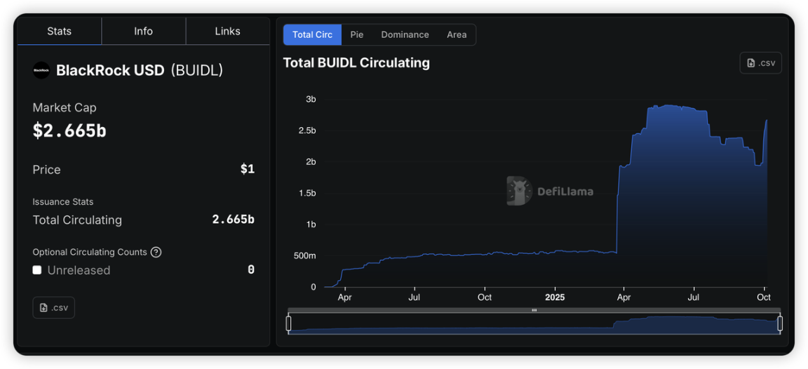 根据 DeFiLlama 数据,全网稳定币市值已突破 $300B。在过去一周内,USDT,USDC,USDe 均录得增长,。贝莱德的 BUIDL 基金在 9 月 27 日后流通量快速上扬,从 19.79 亿,增长到 26.65 亿,其中绝大部分增量来自于以太坊。