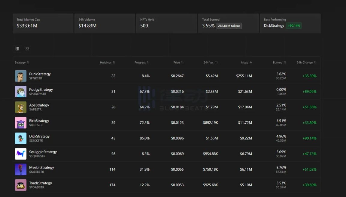 以 PNKSTR 为例:每笔代币交易收取 10% 费率,其中约 8% 注入协议资金池;当资金池累积到可买“地板价”NFT 时,合约会自动买入并以约 1.2 倍价格挂单出售;出售利润再用于回购并销毁代币,形成“买 NFT—卖出—回购燃烧”的飞轮。PunkStrategy 作为首个吃螃蟹者凭借 CryptoPunks IP 和先发优势积累了最高的市值和流动性,其他系列的策略代币通常保留同样的 10% 费率结构,并将其中 1% 用于回购 / 燃烧 PNKSTR,使其具备“母币”属性与板块内生联动。