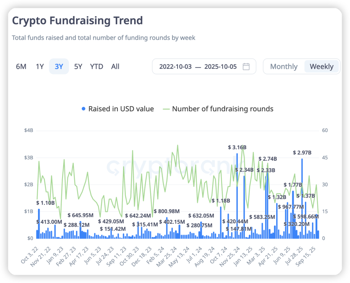 上周一级市场融资金额相对低迷,但是也有较多亮点。据传,Kraken 于 9 月底完成了 5 亿 USD 最新一轮融资,估值达 150 亿美元,将继续冲击 IPO。Bit Digital(BTBT) 则再次通过可转债发行融资 1.35 亿美元,以主要购买以太坊和用作公司其他用途。支付公司 RedotPay 完成 4700 万 USD 的战略论融资,老投资人 Galaxy Ventures、 祥峰投资继续加码,而 Coinbase Ventures 则在本轮入局领投。