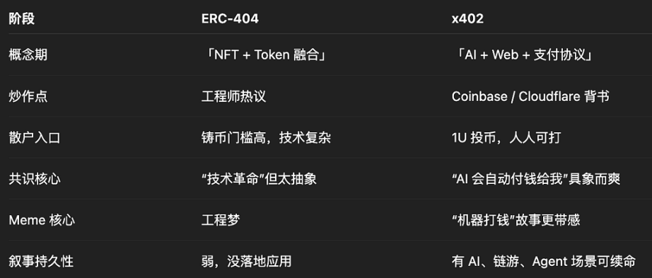 这点非常关键:ERC-404 停在「炒出来的 Meme」,x402 有潜力成为「能花钱的 Meme」。