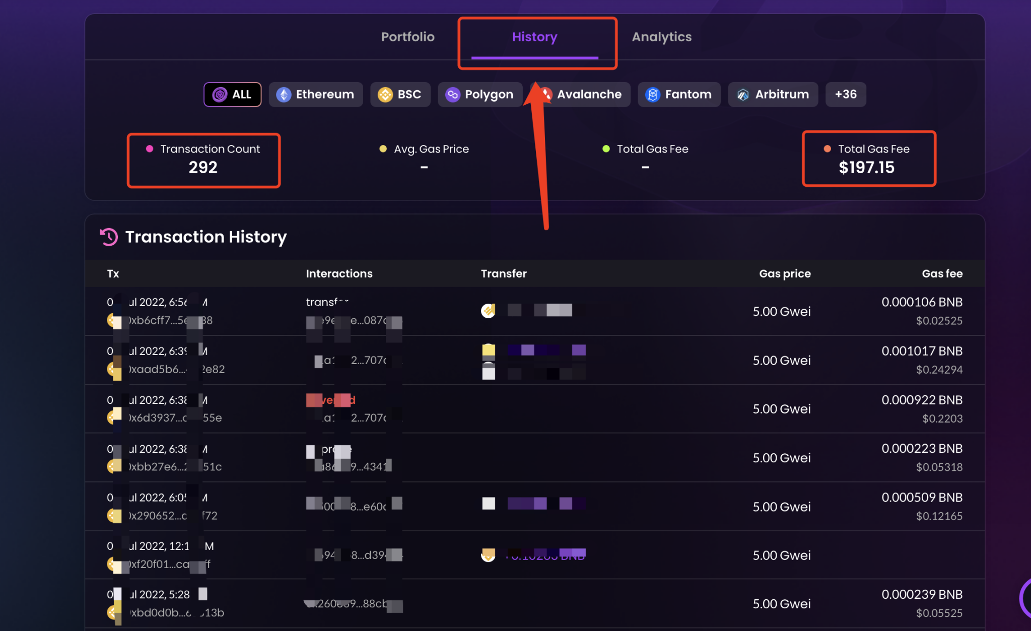 可以查看交易总数,一共花费了多少 Gas 费用,这里我这个测试钱包用了 197.15 刀 Gas 费,交易了 292 次。