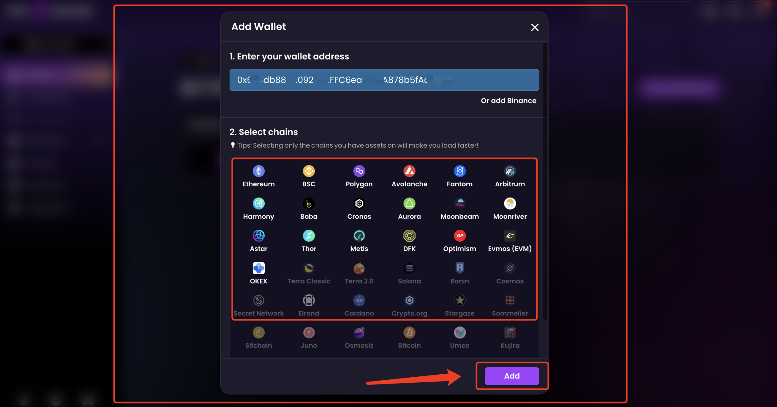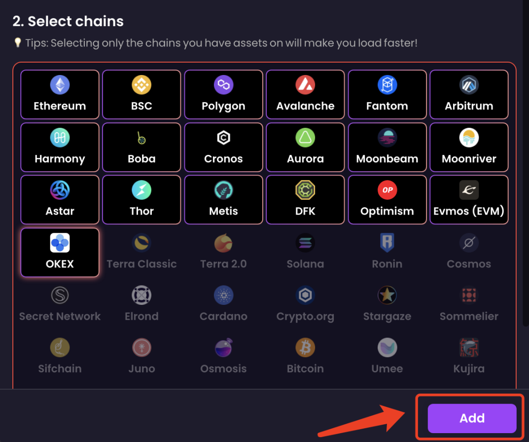 3、我这里输入的是 ETH 地址,支持(19)条链上资产查看,点击下方的【Add】添加