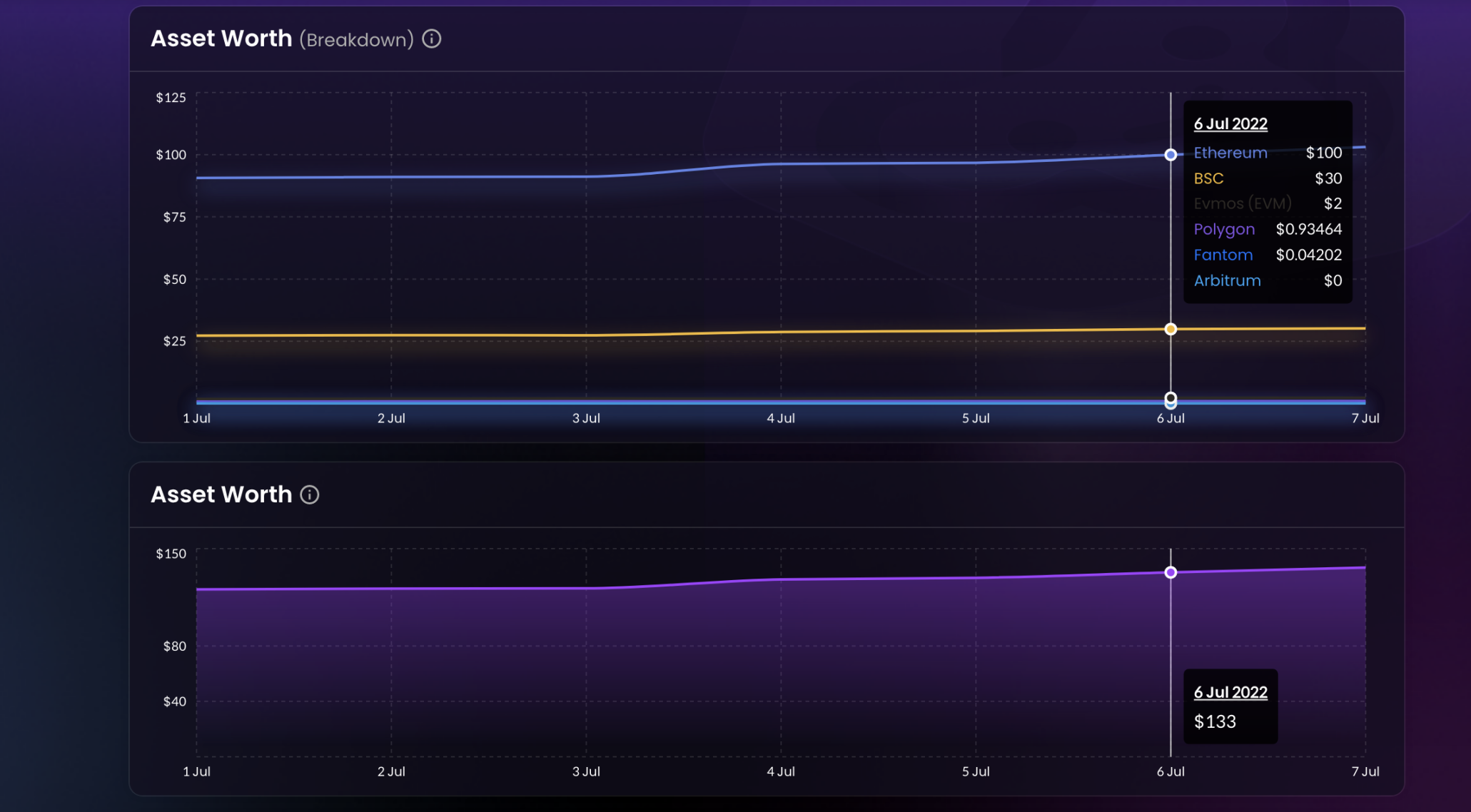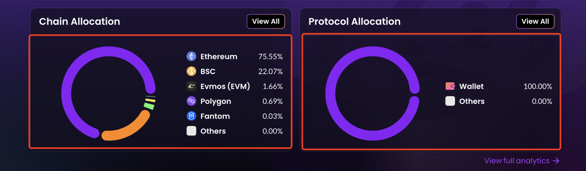 左侧是显示各链的资产占比,右侧显示资产分布的地方,我这个测试钱包的资金全部在钱包里面,所以显示钱包占比 100%,数据比较清晰,看的出来 Nansen 收购了这个产品,因为做的很不错。