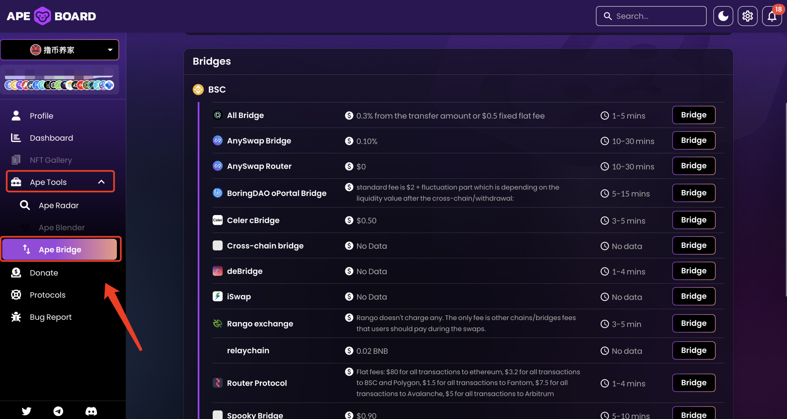 这里 Ape 提供了一个跨链集合,右侧列表,用来跨链的,大家可以了解下,All Bridge 这个产品很熟悉,去年一个兄弟,在这个代币赚了近 100w。