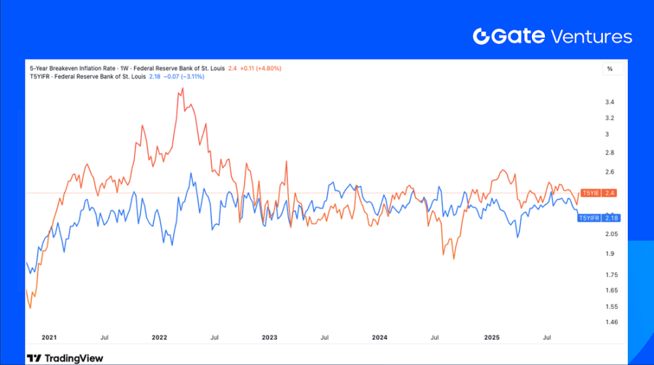 Over the past 12 months, gold prices have soared 60%, breaking its price record. Over the same period, the US dollar index against a basket of major currencies has fallen 10% from its peak and continues to trade in a low, range-bound pattern. Despite the start of the Fed’s rate-cutting cycle, the 10-year U.S. Treasury yield has not adjusted significantly, circulating around the 4.05% — 4.15% range. Key gauges of long-term inflation expectations — the 5-Year Breakeven Inflation Rate (T5YIE) and the 5-Year, 5-Year Forward Inflation Expectation Rate (T5YIFR) have remained broadly stable and close to the Fed’s 2% target, showing no volatility in response to gold’s surge.