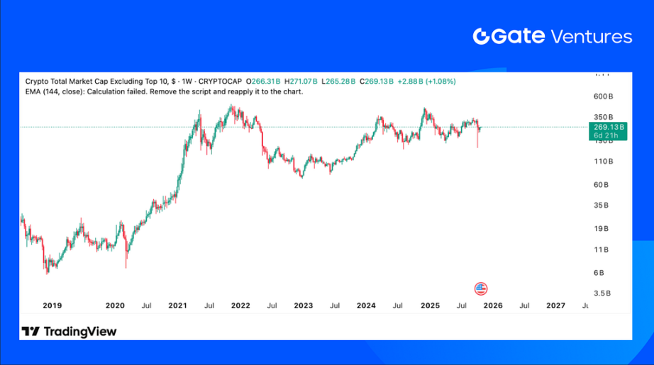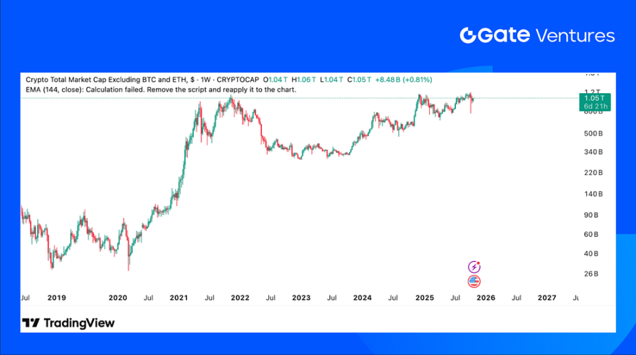 The total crypto market cap climbed 5.3%, while the market excluding BTC and ETH gained 4.22%. The broader market excluding top 10 tokens slightly outperformed, surging 5.52%.