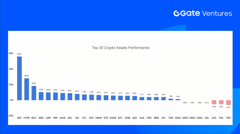 The top 30 cryptocurrencies rebounded strongly from last week’s decline, led by Zcash (ZEC), Hyperliquid (HYPE), and Bitcoin Cash (BCH).