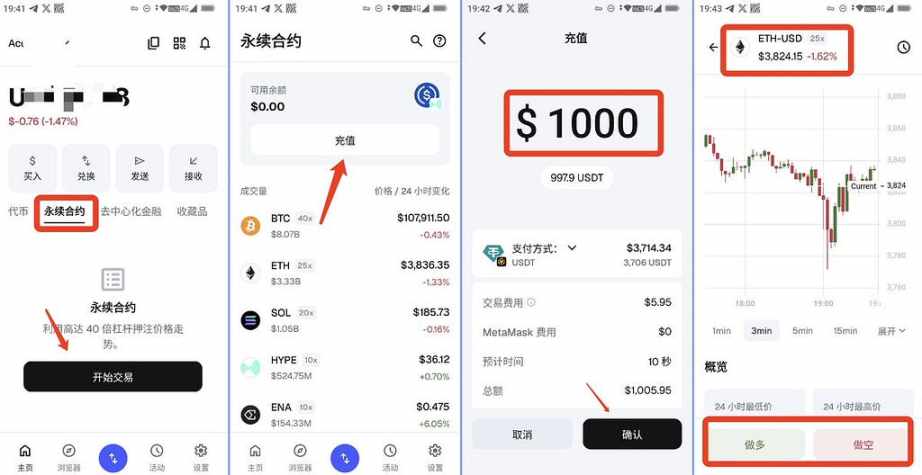 步骤一、在 MetaMask 手机端点击“永续合约”,“开始交易”