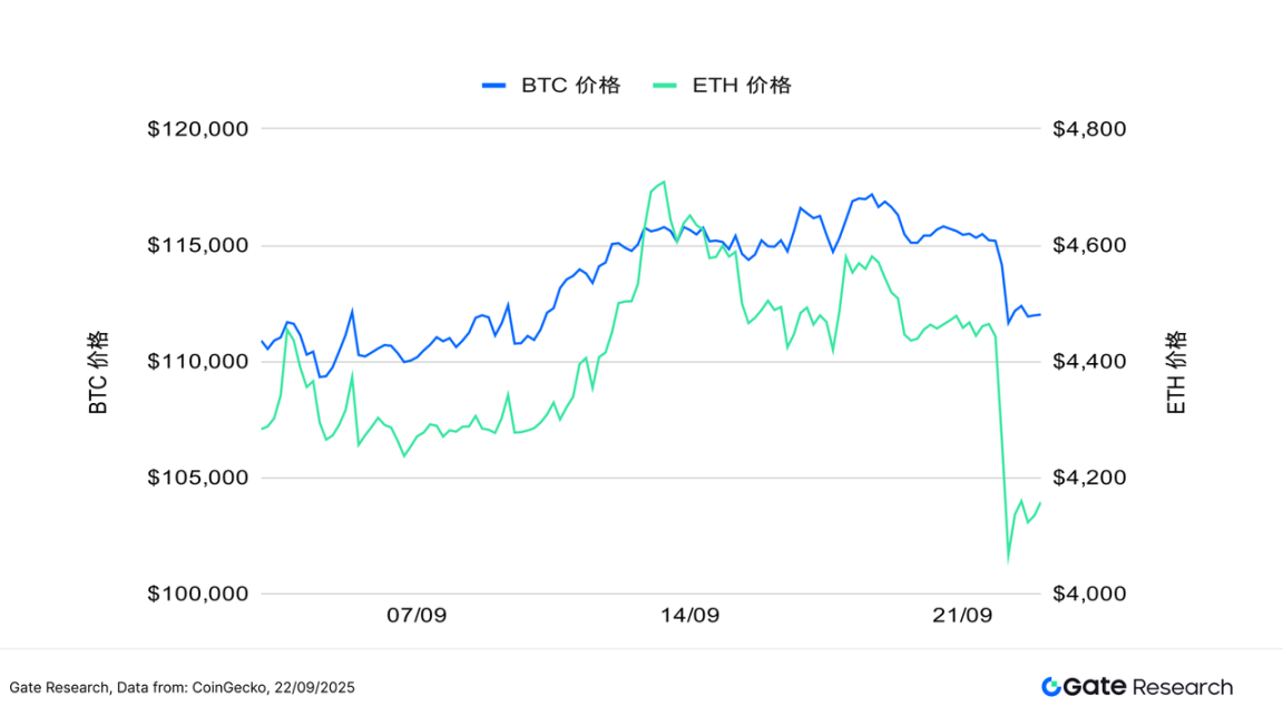 BTC 自 8 月中旬触及 124,400 美元后便持续受阻于 119,000 美元上方,多次尝试突破未果,最终于 9 月中旬开始下探,走势转弱并失守关键支撑区间。ETH 则在突破 4,700 美元后快速回落,并于 9 月 21 日加速下跌,最低触及 4,067 美元,显示短期弱势结构已形成。【1】【2】【3】