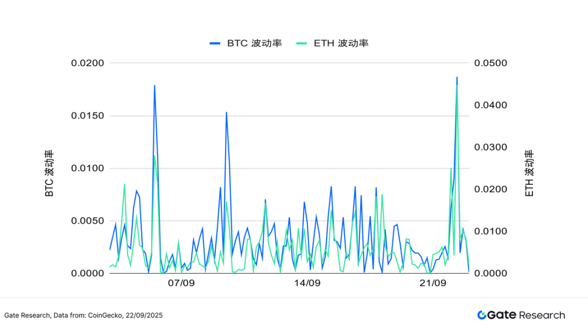为了系统呈现当前加密货币市场的资金行为与交易结构变化,本报告从五个关键维度切入:比特币和以太坊的价格波动率、多空交易比率(LSR)、合约持仓金额、资金费率与市场爆仓数据。这五项指标涵盖了价格走势、资金情绪与风险状况,能较为全面地反映当前市场的交易强度与结构性特征。以下将依序分析各项指标在 9 月 9 日以来的最新变化: