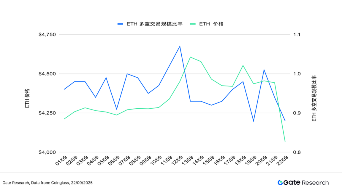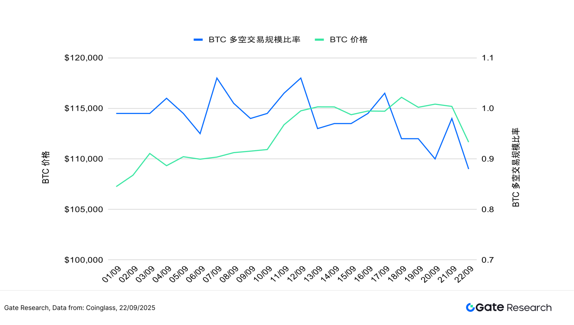最大规模爆仓出现在 9 月 22 日,当日多单爆仓金额激增至超 16 亿美元,远高于前期平均水平,表明市场在关键支撑失守后出现集中清算,追多资金踩踏出场,短线情绪转趋谨慎。