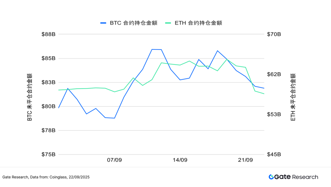 据 Coinglass 数据,BTC 与 ETH 合约持仓金额整体维持在相对高位区间,杠杆资金未明显撤出,市场博弈氛围仍在延续。【6】BTC 合约持仓金额在 9 月上旬快速上升至 860 亿美元后,自高位明显回落,显示多头杠杆资金阶段性减仓避险,市场短线情绪转趋保守。相比之下,ETH 合约持仓金额走势更为稳健,虽有波动但整体降幅有限,反映出杠杆资金对 ETH 的持仓配置相对稳定,撤离速度较慢。