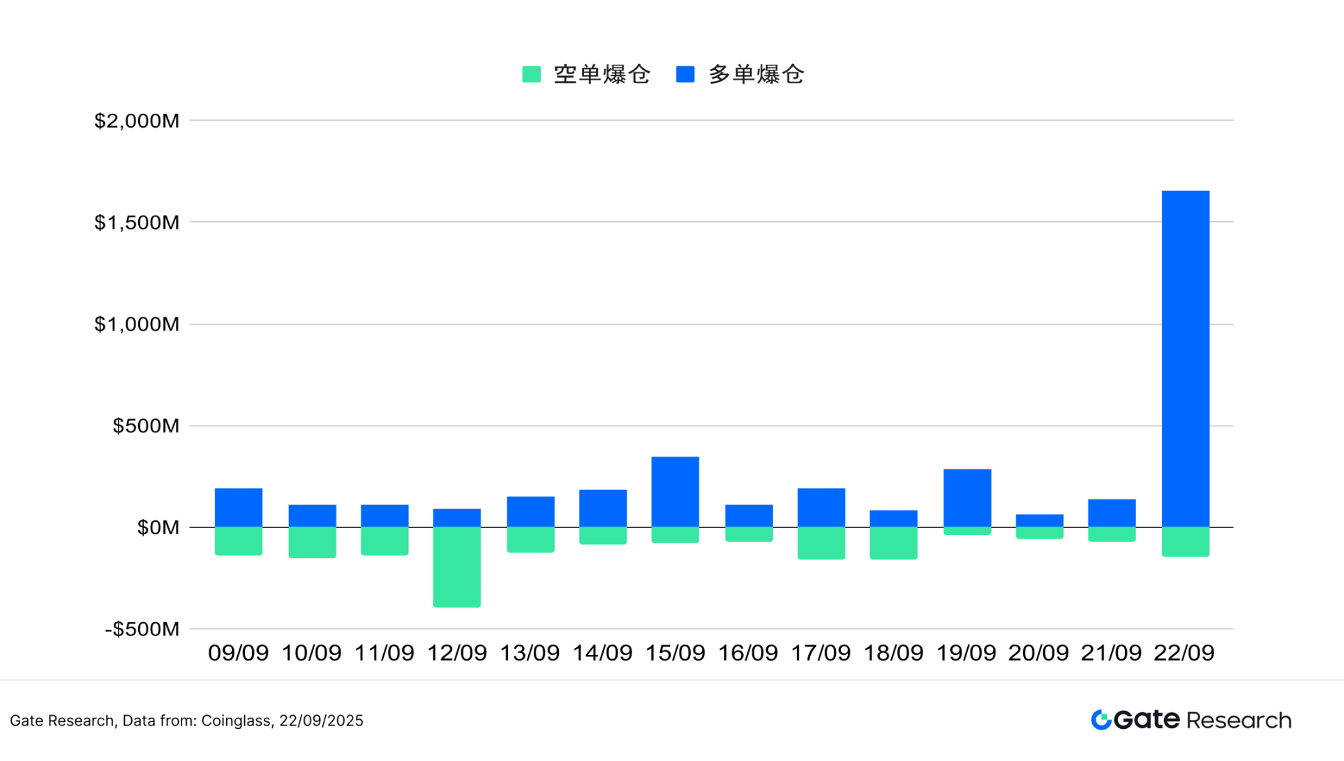 • 9 月 22 日,多单爆仓金额激增至逾 16 亿美元,突显市场高位承压,多头踩踏式止损加剧情绪转弱。