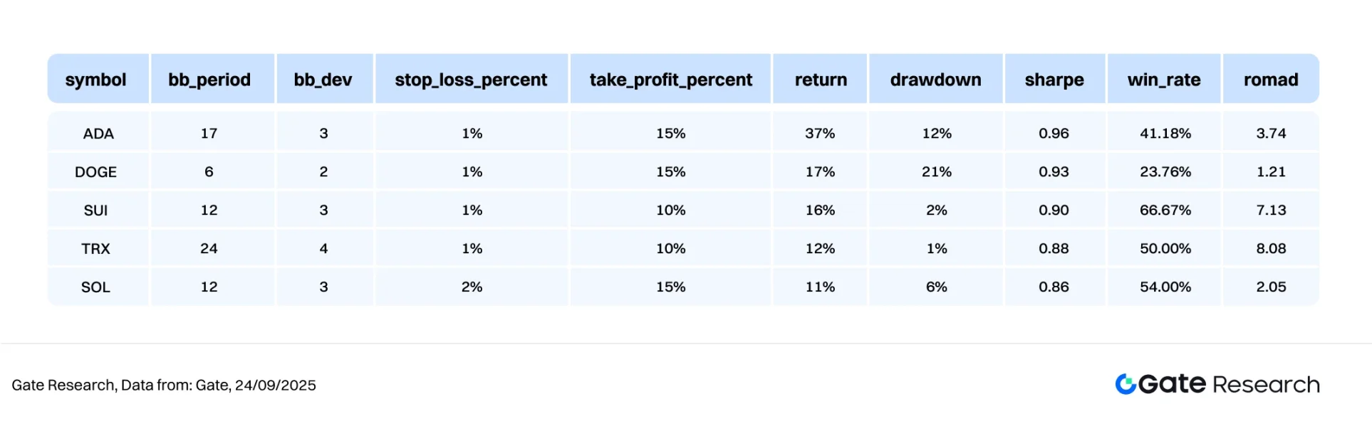 以加密市值前十项目(排除稳定币)为例,本文回测了 2025 年 1 月至 9 月期间的 1 小时 K 线数据,系统共测试 630 组参数组合,并筛选出年化报酬率表现最优的五组。评估标准包括年化报酬率、夏普值、最大回撤与 ROMAD(报酬与最大回撤比),以全面衡量策略在不同市场环境下的稳定性与风险调整后绩效。
