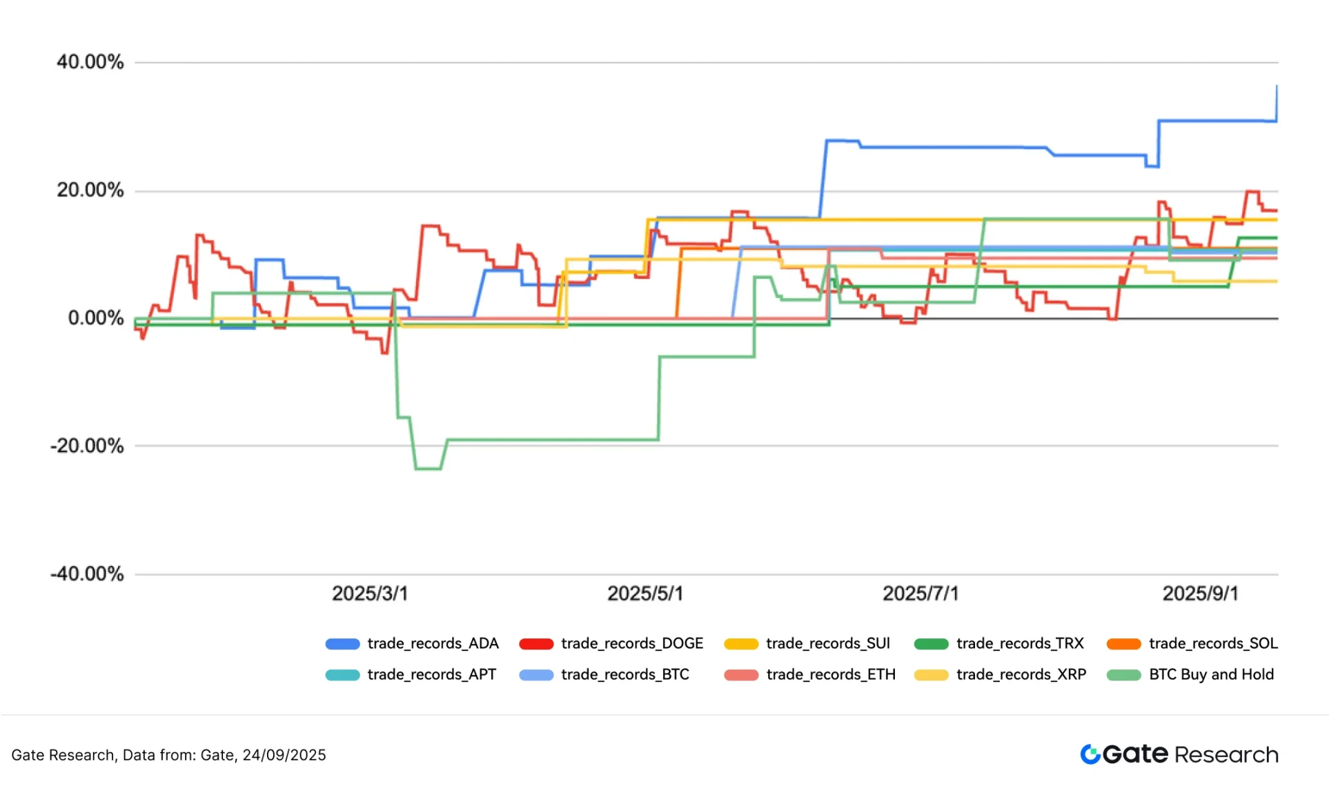 其中,ADA 策略表现最为突出,自 5 月起明显脱离盘整区间,至 9 月累计收益率突破 35%,为所有币种策略中表现最佳;DOGE 策略也维持稳定的上升趋势,最终收益超过 15%。相比之下,ETH 与 TRX 策略在年中出现明显回撤,尤其是 TRX 一度下跌接近 -30%,反映出策略在特定震荡行情下的波动风险。
