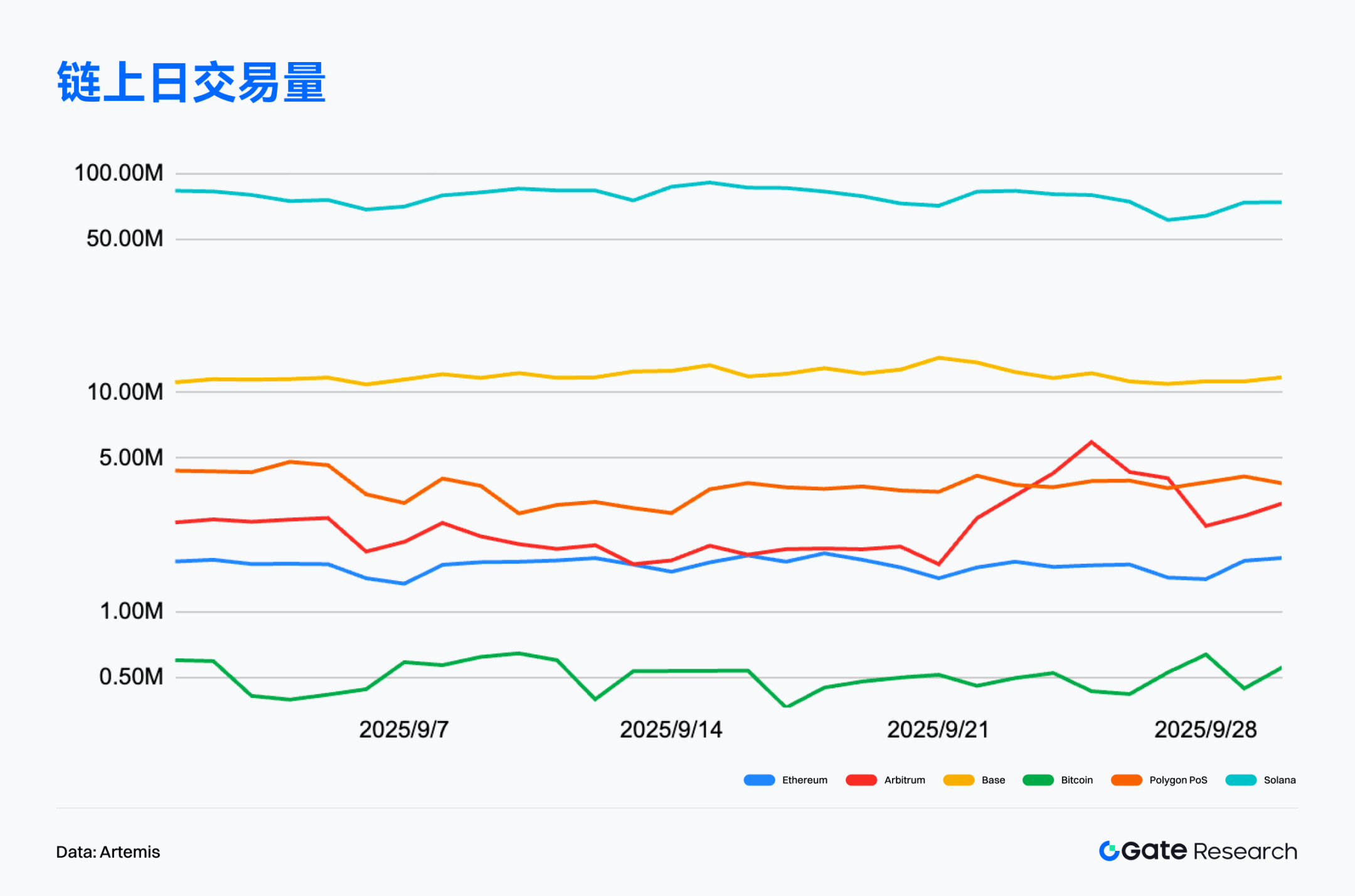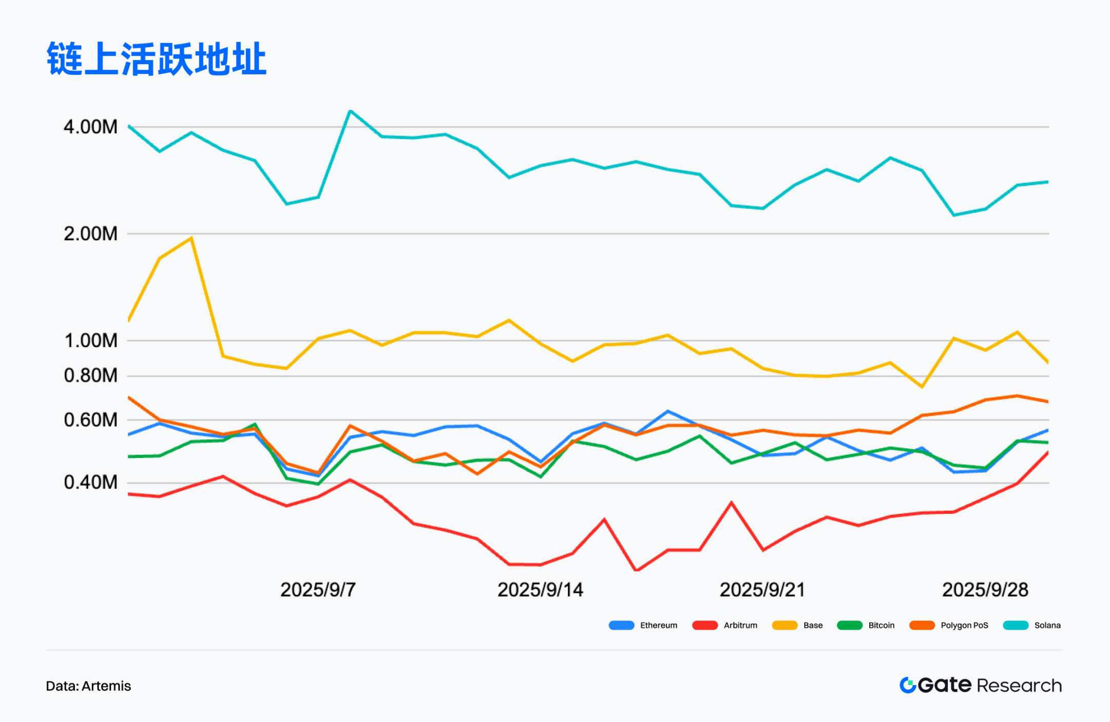 值得注意的是 Arbitrum,虽然月初较为低迷,但自 9 月中旬后活跃地址明显回升,月底已接近 70 万水平,回暖趋势显著,其中 DeFi Renaissance 激励计划(DRIP)被视为推动用户回流的重要因素。