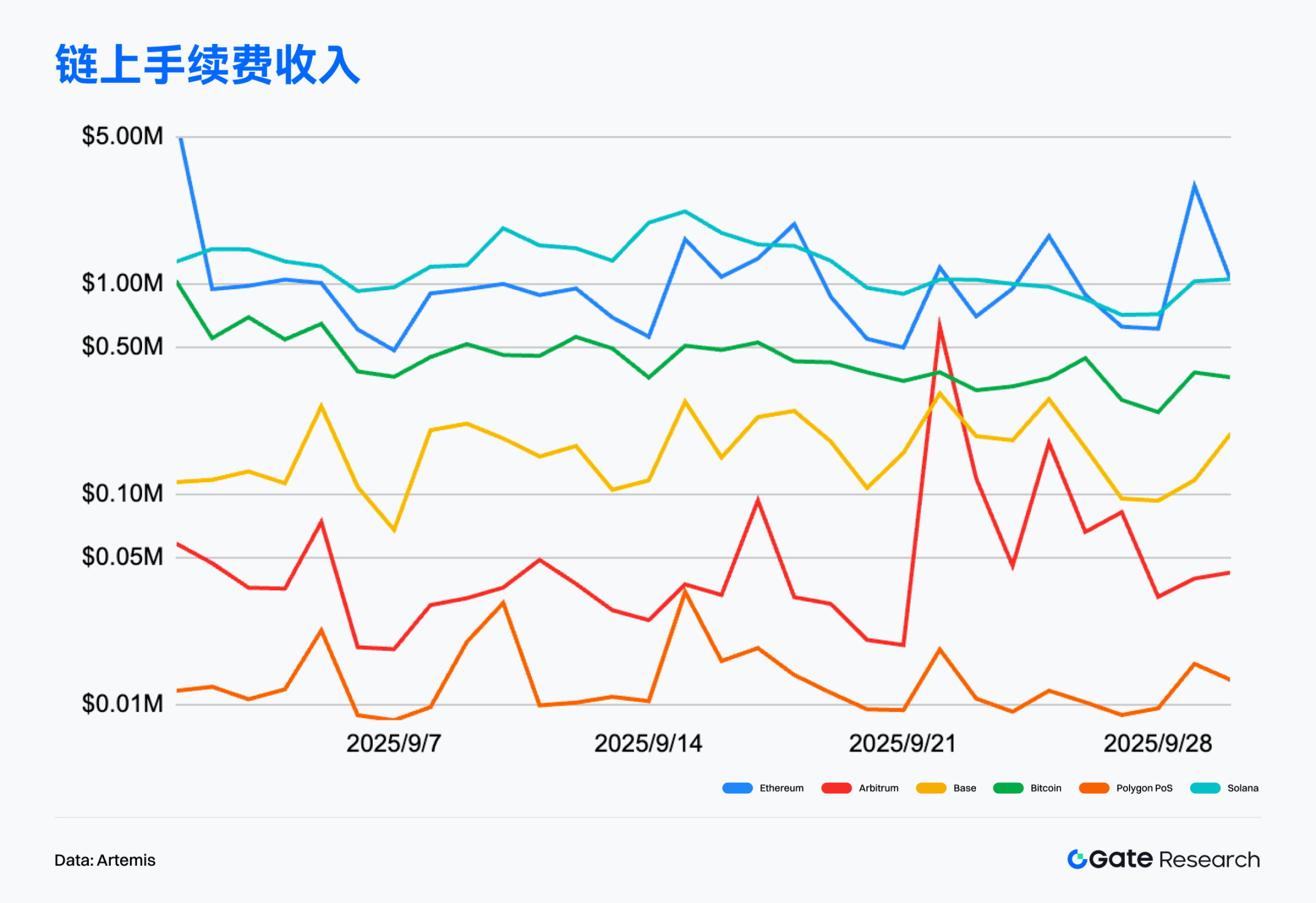 Arbitrum 同样出现 8.88% 的收入回落,不过 9 月中下旬一度出现突发高点,显示短期激励效果可能带来波动性提升。Polygon PoS 是唯一手续费收入大幅增长的主流公链,较上月增长超 40%。 此一增长可能与 9 月 11 日 Polygon PoS 网络完成硬分叉升级有关,生态同步推进关键版本更新。