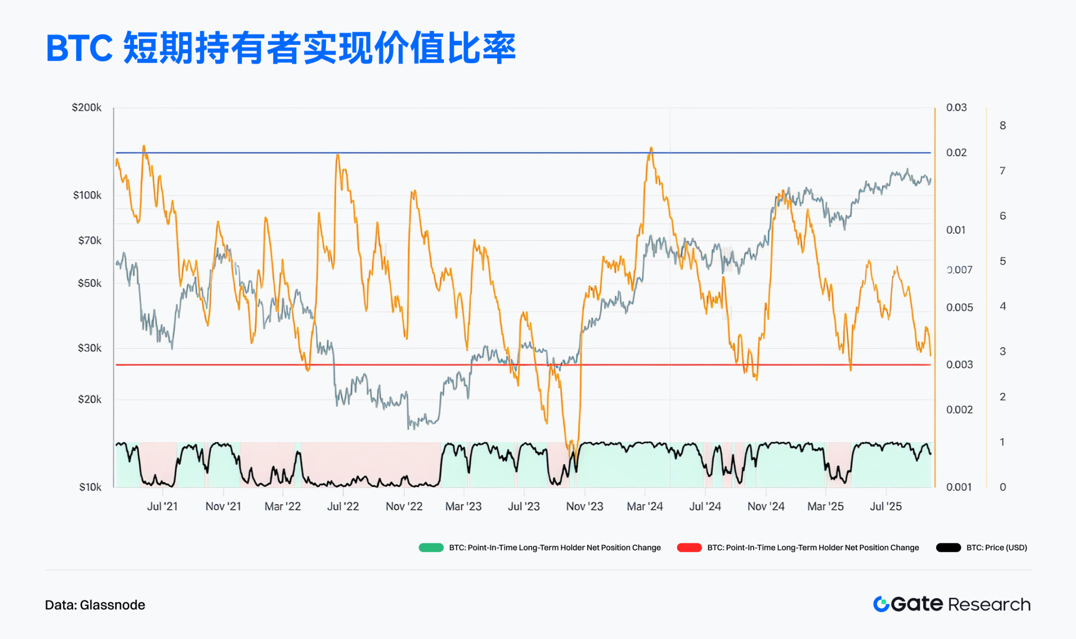 据 Glassnode 数据,短期持有者实现价值比率(Short-Term Holder Realized Value RVT)近期持续下探,已接近 0.003 的“市场冷却极限”区间,反映出链上资金活动处于极低水平。RVT 值越低,代表链上交易量相较于已实现市值越低,亦即新资金进入市场的活跃度不足。目前 RVT 维持在历史低位区域,显示市场交投热度明显降温,短期投机资金参与意愿偏低。【7】