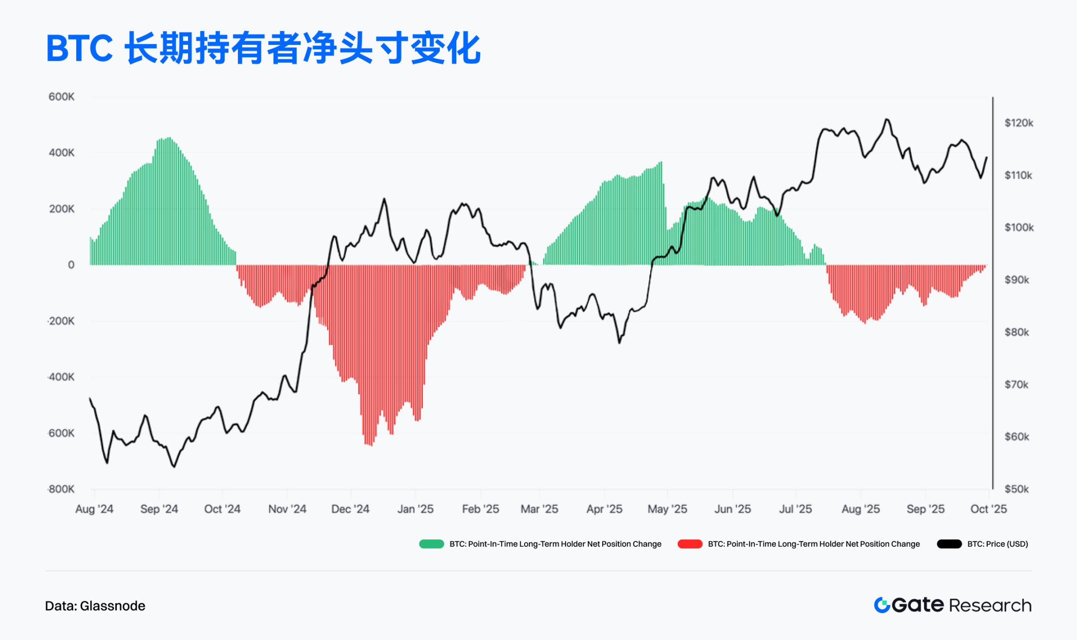 据 Glassnode 数据,长期持有者净头寸变化(Long-Term Holder Net Position Change)已连续数周转为负值,反映出近期长期持币人持续将资产移出囤币状态,可能进行出售或流通。图中红色柱状区域代表长期持币者整体处于净减仓状态,过去两个月整体累计流出约达数十万枚 BTC,表明部分老手选择在高位逐步了结,降低持仓风险。【8】
