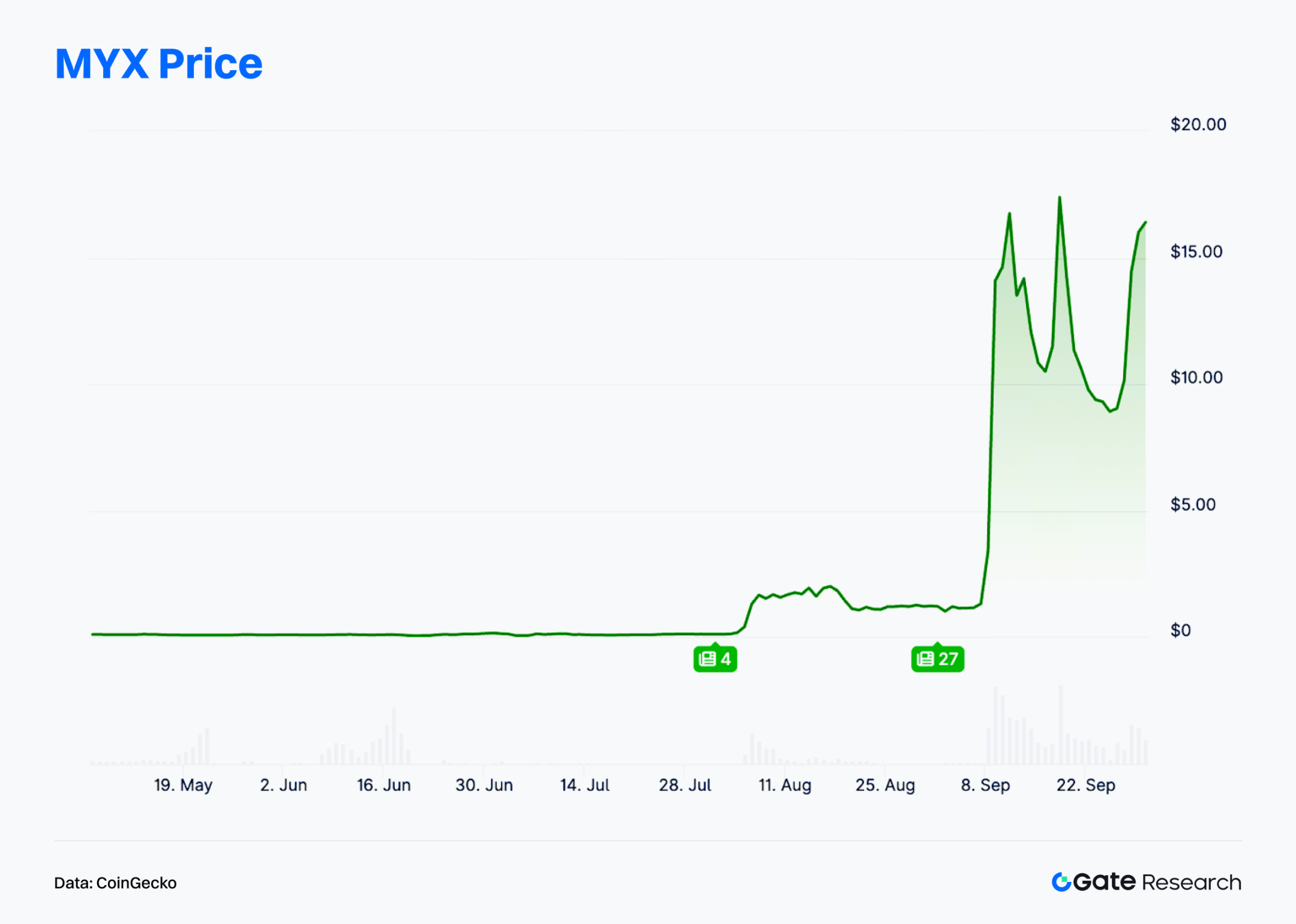 据 CoinGecko 数据显示,MYX 于 9 月 30 日当周涨幅达 63.25%,价格一度冲高至 16.40 美元,表现显著跑赢大盘。在本轮上涨中,宏观环境与项目基本面形成共振效应。一方面,全球市场流动性温和回升,资金风险偏好上升,资金开始流入中小市值代币板块,MYX 因题材新颖与估值弹性受到市场关注。另一方面,MYX 协议近期上线关键模块,开启新一轮流动性激励计划,并公布与多方生态合作更新,引发用户与资金加速进入。【10】