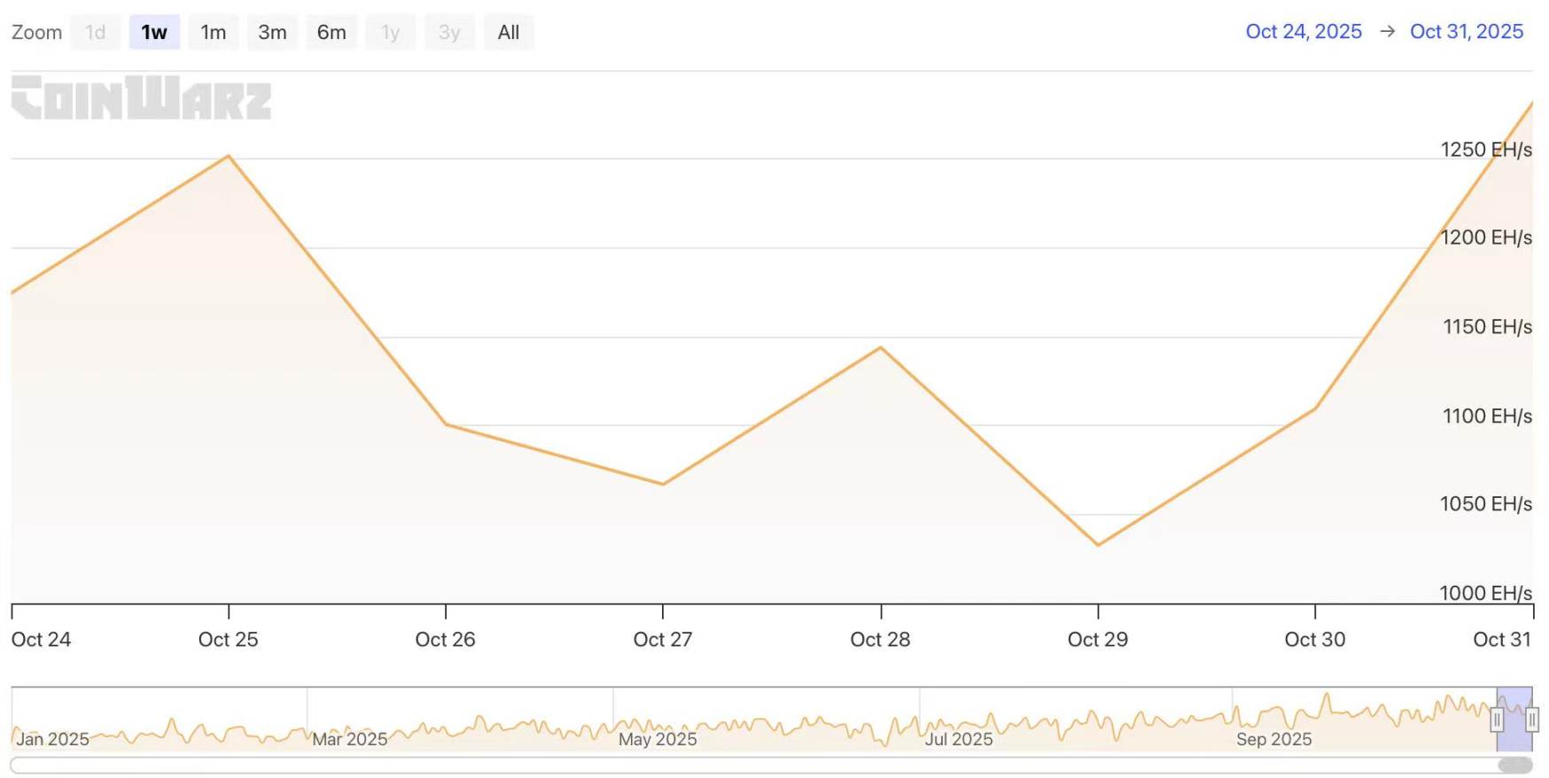 过去七天,比特币网络哈希率整体呈现波动,本周哈希率维持在 1032.58 EH/s 至 1281.76 EH/s 区间,处于相对高位。