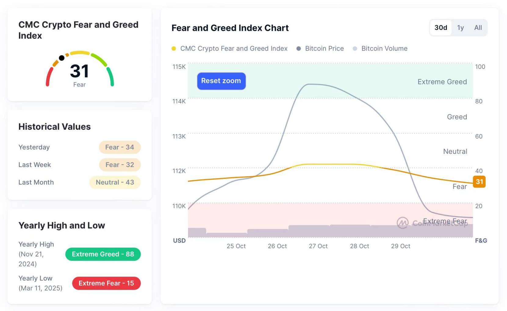 截至 10 月 24 日,恐惧与贪婪指数(Fear & Greed Index)报 31 点,位于“恐惧”(Fear)区间,显示市场整体情绪谨慎偏空。