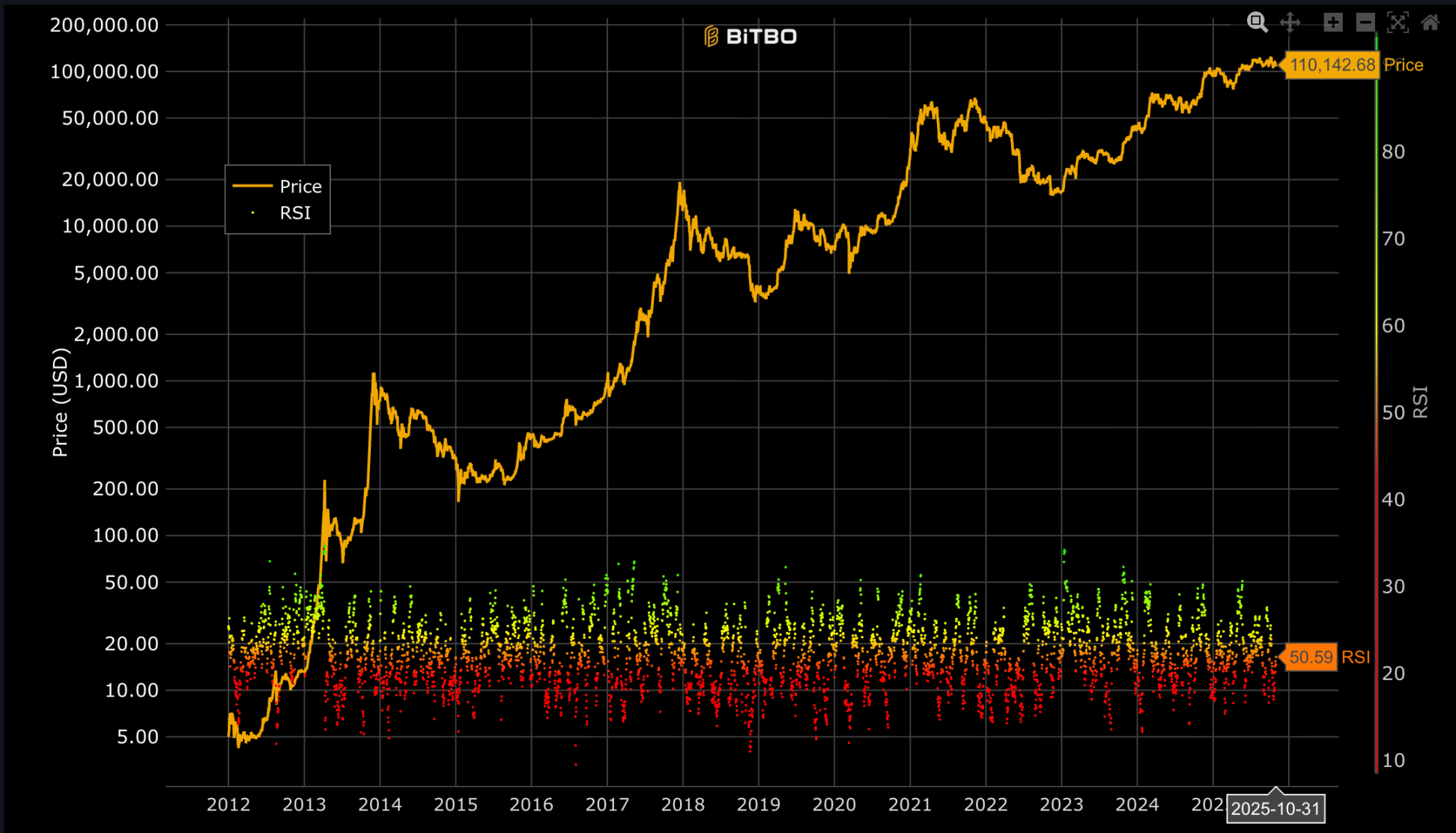 根据 Bitbo 数据,截至 2025 年 10 月 31 日,比特币 14 日 RSI 为 50.59 。RSI 指数处于中性区域(50 附近),既未显示明显超买(>70),也未显示超卖(<30),表明市场当前多空力量相对均衡。