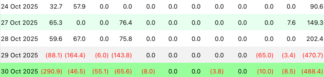 数据显示前两日为净流入,随后两日出现大额净流出,短期资金波动增加。后两日大额净流出则与宏观政策密切相关,鲍威尔在 10/29 表示“12 月降息并非板上钉钉”,削弱了市场降息预期,对风险资产形成短期冲击,促使机构谨慎降低 ETF 敞口。整体来看,ETF 资金流入 / 流出短期波动幅度较大,但结合链上及交易所资金流向,长期机构仍维持一定持仓,印证市场仍处于“卖压减弱 + 持币累积”阶段。
