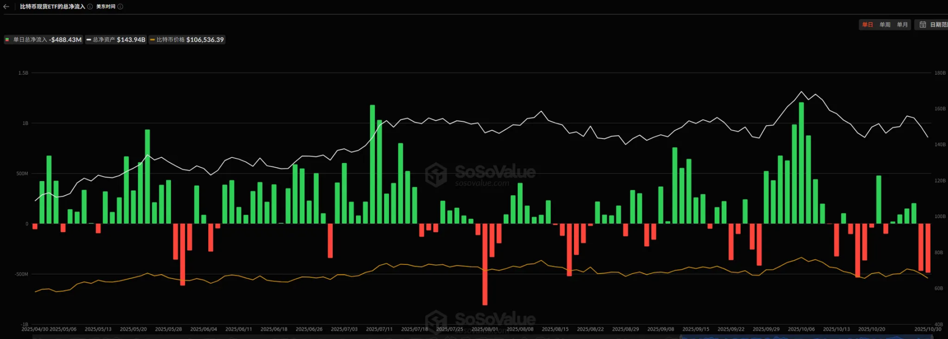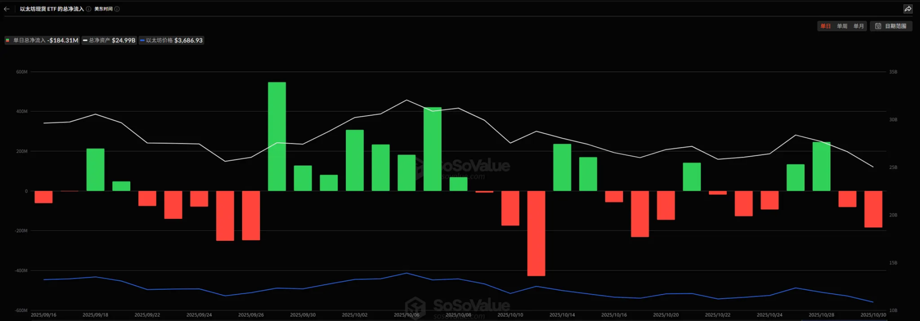 比特币 ETF 净流出 5.1676 亿美元,流出规模较上周进一步扩大。10 月 28 日出现关键转折:当日 ETF 流入达周内高峰,但 BTC 价格未同步新高,显示卖盘消耗了买入力量,随后资金转为大幅流出。