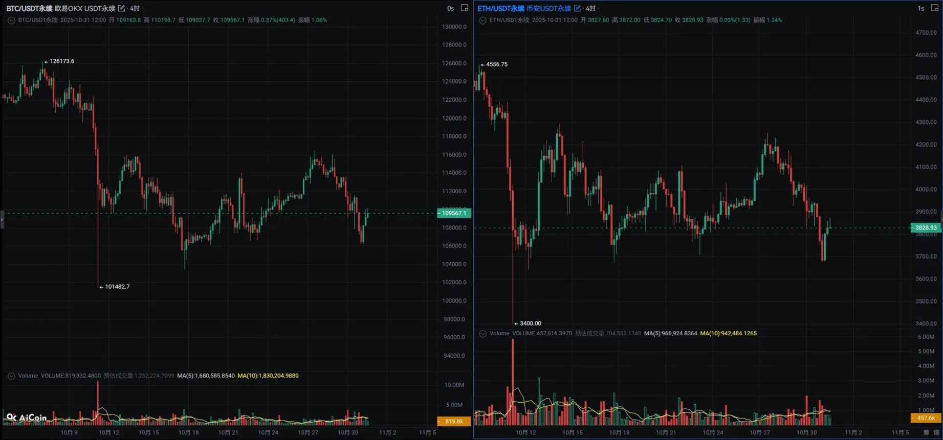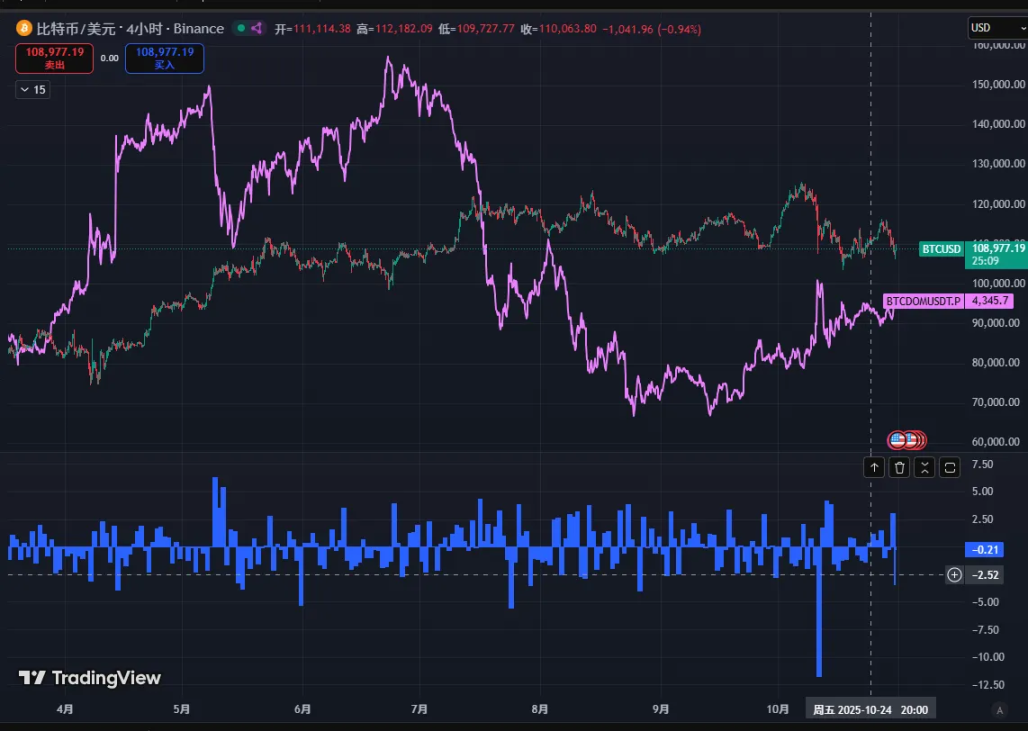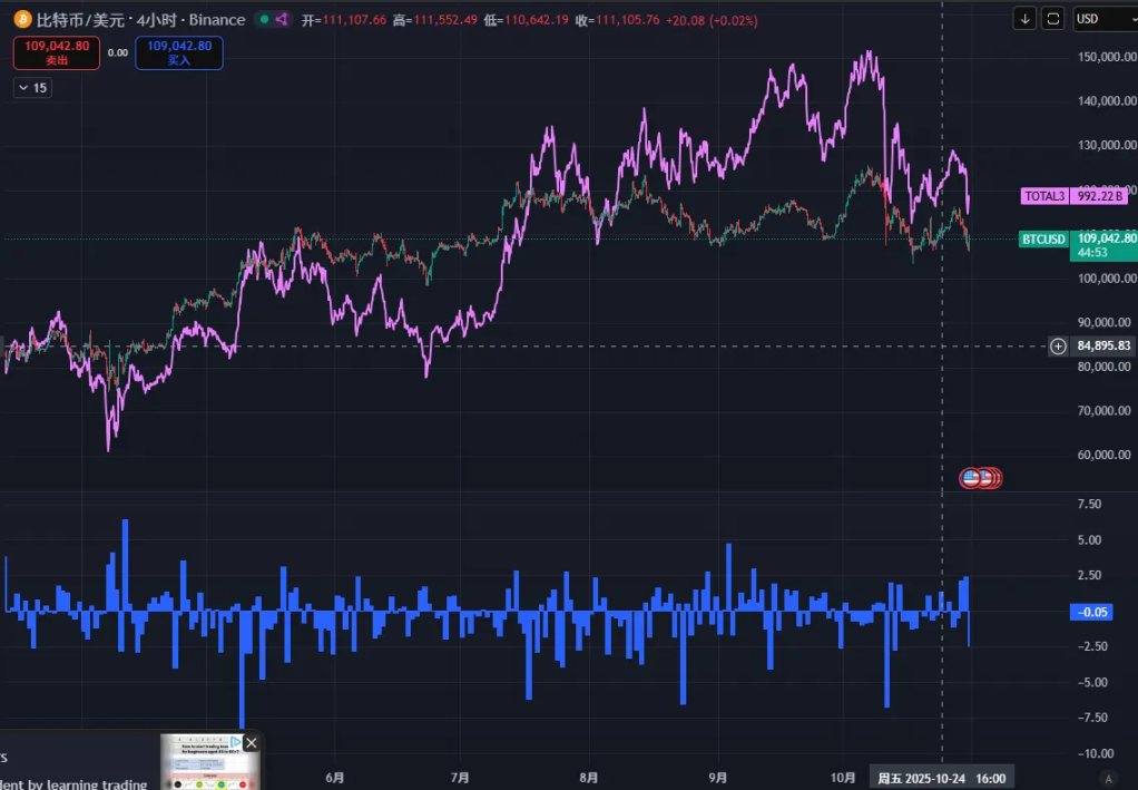 但 10 月 28 日市场拐头向下,跌破 112500 点,宣告关键位突破失败。周四美联储议息会议落地(宣布降息 25 个基点)前,市场已进入震荡下跌,完全收回前期涨幅,日线级弱势格局确立,后续大概率延续下行走势。