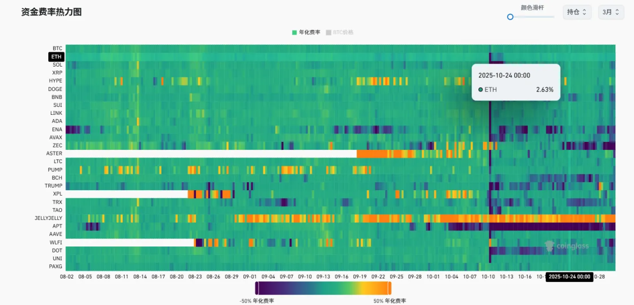 热点与热度:Base 链 X402 协议、AI 板块(Virtuals、Aixbt)及隐私代币(ZEC)表现活跃,但热点持续性不足;多数山寨资金费率为负,参与度低迷。