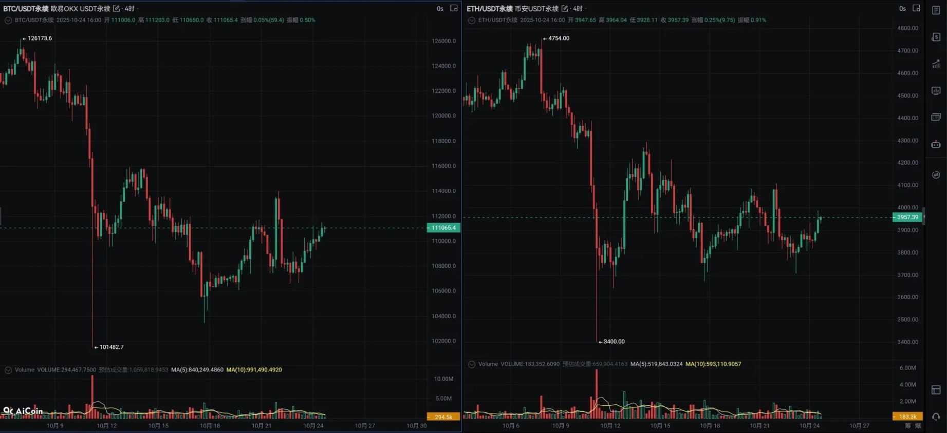 本周市场呈现 “冲高回落” 的过山车走势。10 月 24 日一小时级别的下杀后,市场受美联储降息预期支撑进入窄幅横盘,空头表现乏力。10 月 26 日突破横盘区间,强势站上 115000 点,逼近 116000 点这一关键阻力位(去年 11 月 14 日反弹高点)。