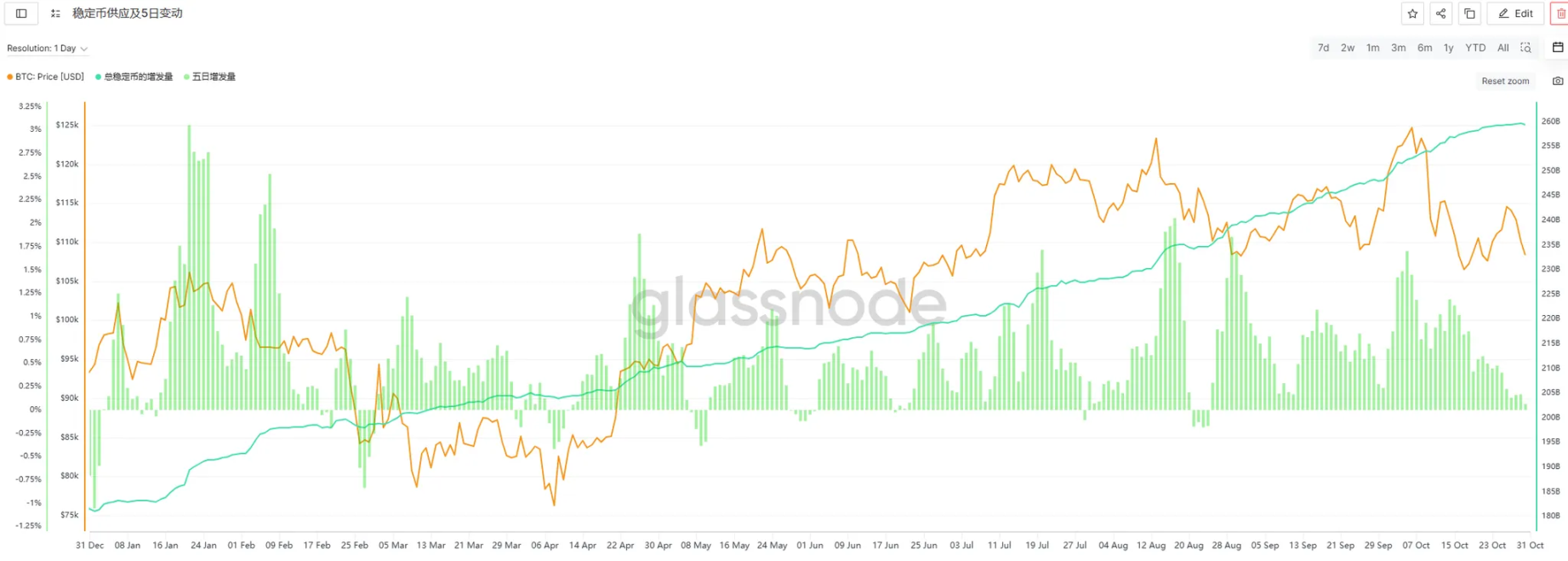 本周稳定币总规模达 2593.57 亿美元,单周仅增发 3 亿美元,日均增发 0.43 亿美元,较上周环比骤降 82.4%。资金流入的显著放缓,成为后半周大盘走弱的重要诱因,后续需关注增发能否回归强势水平以支撑上涨。