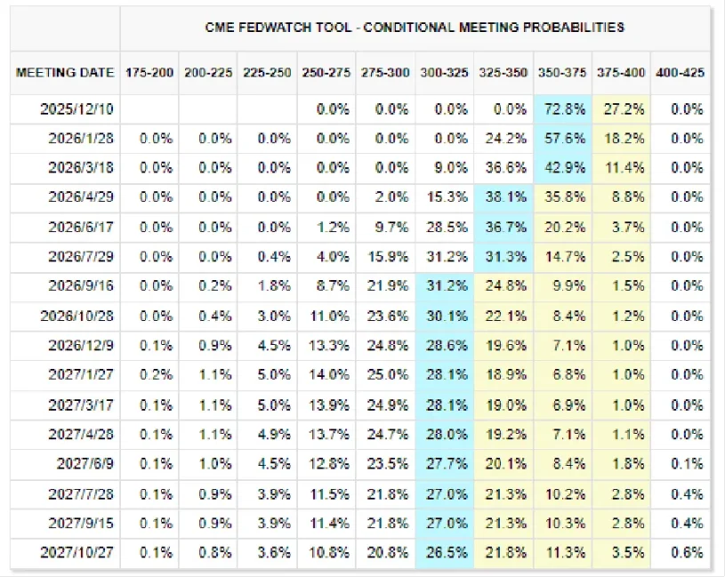 利率互换市场数据显示,2025 年 12 月 10 日降息 25BP 的概率为 73%,年内仅剩余此次会议;2026 年市场预期将在 4 月和 9 月各降息 25BP,累计 50BP,中性利率有望降至 3.25%。巴克莱银行指出,当前市场定价过于鹰派,未充分反映劳动力市场走弱及新任美联储主席可能采取的鸽派立场,未来存在预期修正空间。
