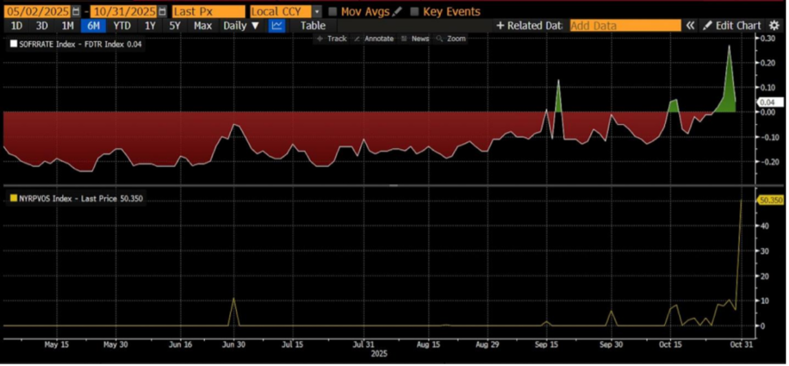 这表明美国短端资金市场出现明显紧张迹象,美联储被迫重启临时回购操作(Overnight Repo Operations),于 10 月 31 日向市场注入近 300 亿美元流动性。