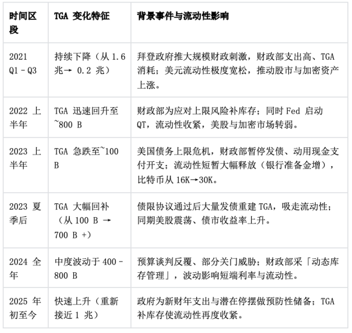 当国会预算僵局迫近、关门风险上升时,财政部会提前发债筹资、拉高 TGA 余额,确保政府停摆期间仍有现金支付必需支出。