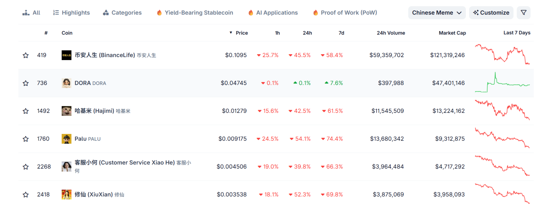 截至 11 月 4 日,中文 Meme 全线溃败:PALU 一周跌 70%,哈基米跌 61%,客服小何跌 66%,修仙跌 69%。生命周期从周缩短至天,市值门槛从亿级降至百万级,大部分项目存活不到 48 小时。