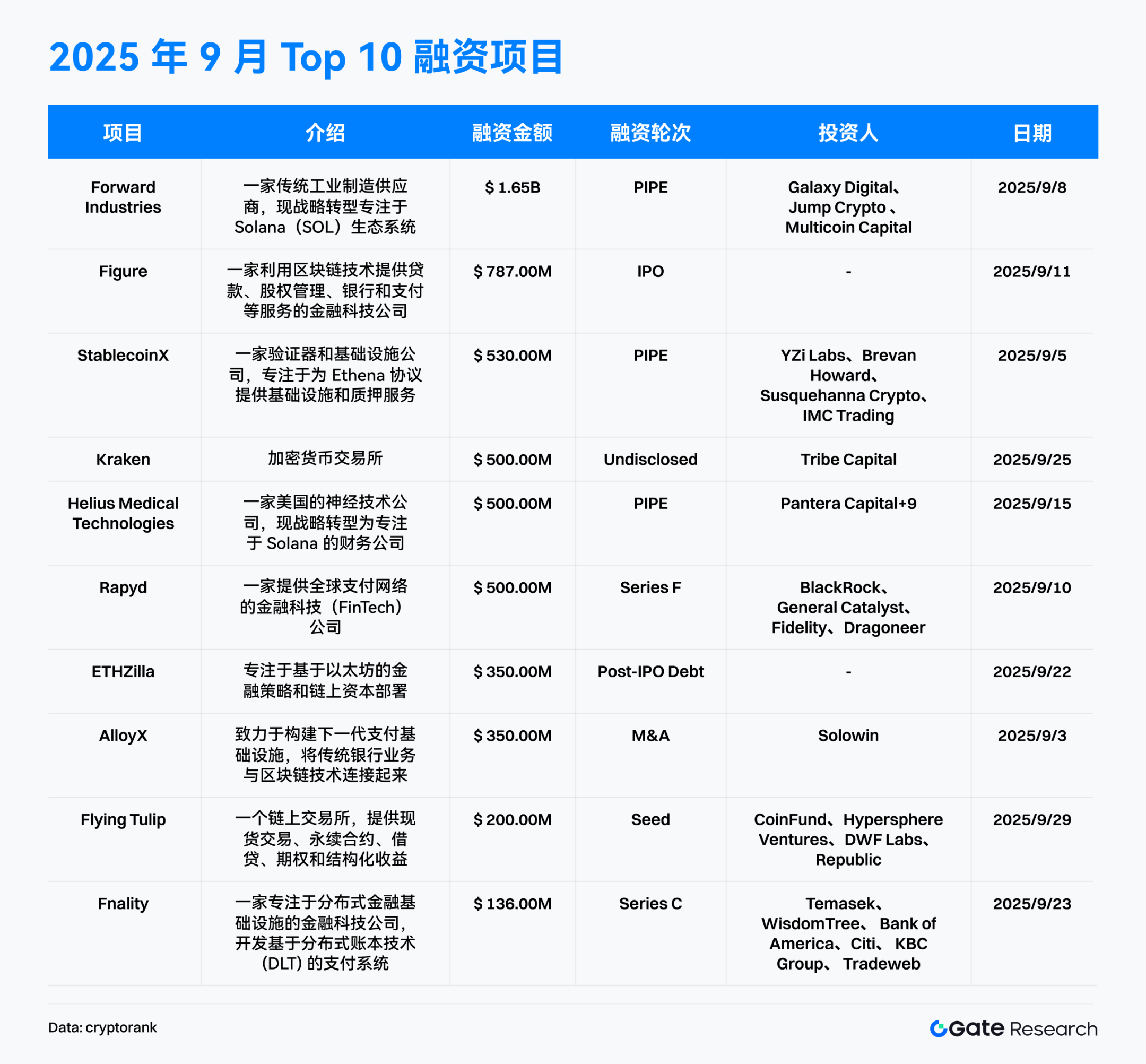 从结构上看,9 月的 Top10 融资项目中 CeFi 赛道强势领跑,占据 7 个席位并贡献主要融资额,资本重心明显回归具备真实收益模型与合规潜力的中心化机构。更重要的是,自“公链资产化”成为新一轮战略主题以来,多家上市公司及新兴金融机构已明确表示将融资资金用于构建特定公链金库,成为项目获取大规模资金的重要方式。Forward Industries(16.5 亿美元)与 Helius Medical Technologies(5 亿美元)通过 PIPE 资金布局 Solana(SOL)生态金库,而 ETHZilla(3.5 亿美元)聚焦以太坊资产配置,显示主流公链代币正被纳入企业财务储备体系。与此同时,Figure(7.87 亿美元,IPO)与 StablecoinX(5.3 亿美元,PIPE)分别聚焦区块链金融服务与 Ethena 协议底层质押,进一步强化 CeFi 赛道的机构化与金融化趋势。
