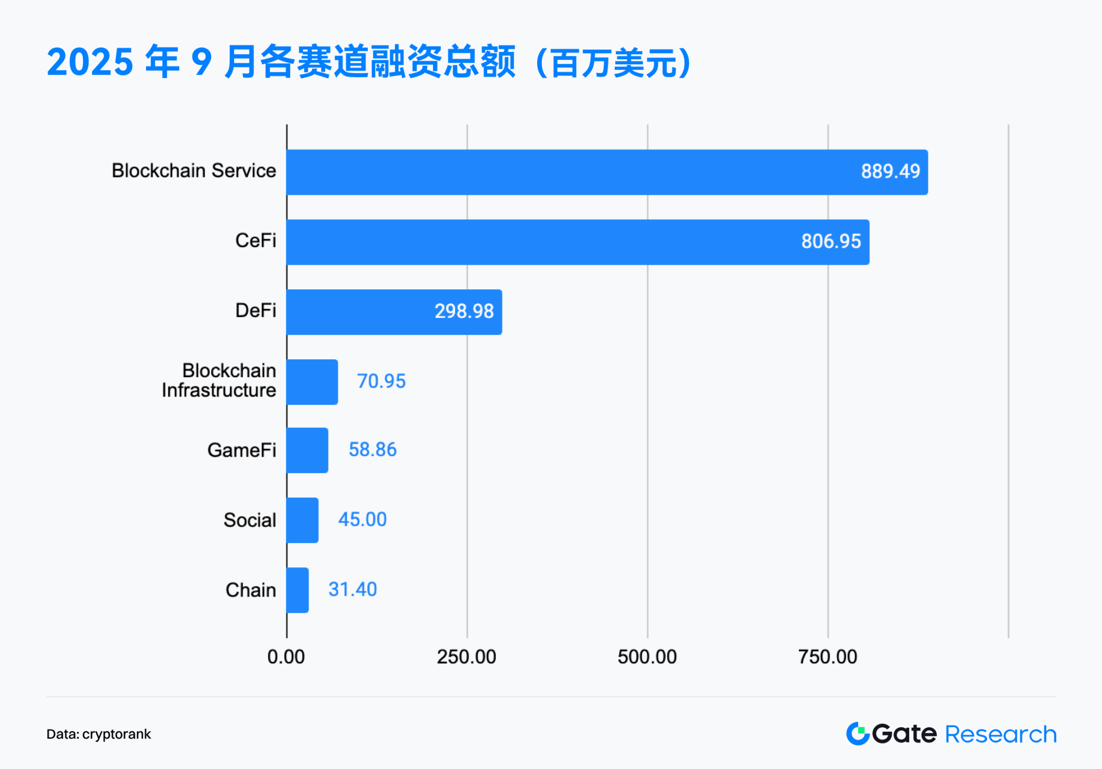 根据 Cryptorank Dashboard 数据,2025 年 9 月 Web3 各赛道融资格局呈现出明显的“双核驱动”特征——区块链服务(Blockchain Service)与 CeFi(中心化金融)成为主导力量。其中,区块链服务赛道以 8.89 亿美元的融资总额位居首位,强势超越长期领跑的 CeFi,显示出资本正加速流向能够为整个 Web3 生态提供底层支撑的技术平台、数据服务与解决方案类项目。这类“卖水人”角色被视为推动行业扩容与降本增效的关键。