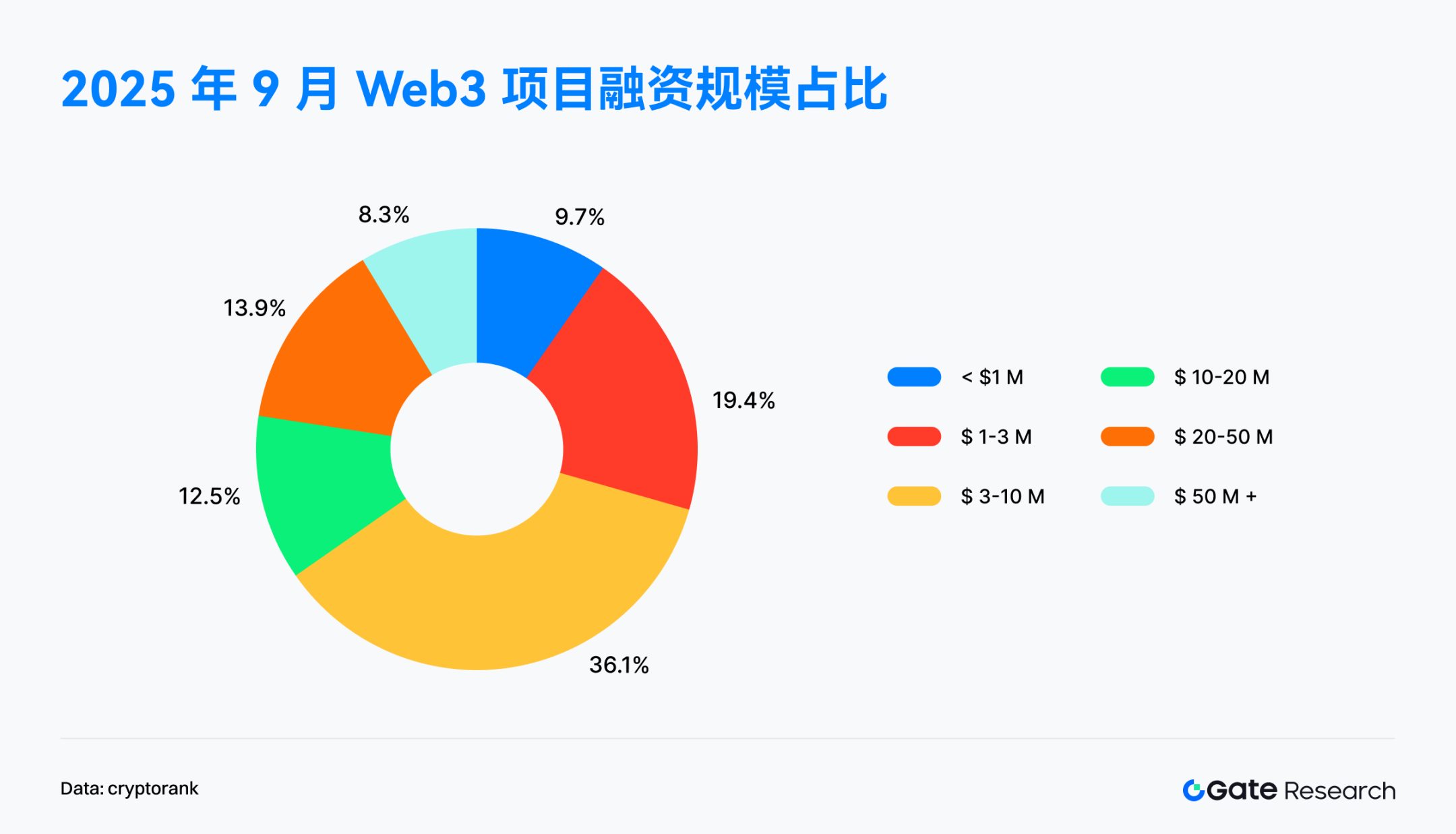 根据 2025 年 9 月披露的 72 起 Web3 项目融资数据来看,中小额融资(300 万至 1,000 万美元区间)依旧是市场主流,占比超过三分之一,显示资本仍高度关注具备增长潜力的早期项目。100 万至 300 万美元区间的融资占比达 19.4%,较上月的 12.5% 明显提升,表明在资本趋紧的环境下,孵化型与种子轮项目依然具备韧性,投资者更倾向于支持拥有技术突破或明确应用场景的初创团队。相对而言,100 万美元以下的小额融资占比由上月的 15% 降至 9.7%,反映市场对“纯概念型”项目愈发谨慎。