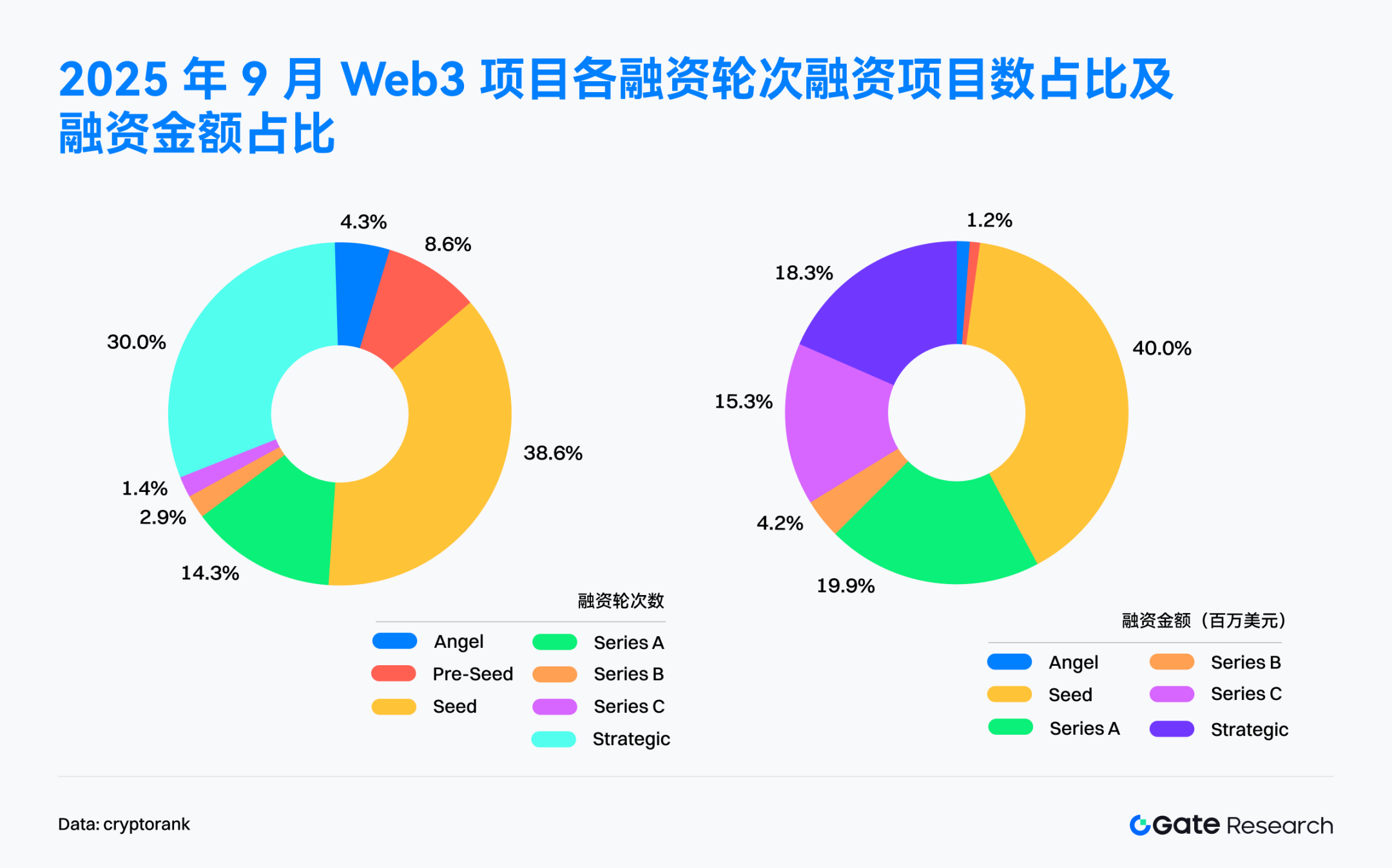 根据 2025 年 9 月披露的 67 起 Web3 项目融资轮次数据,市场结构呈现出明显的“种子轮主导数量和金额,中后期轮次高度精选”的特点。